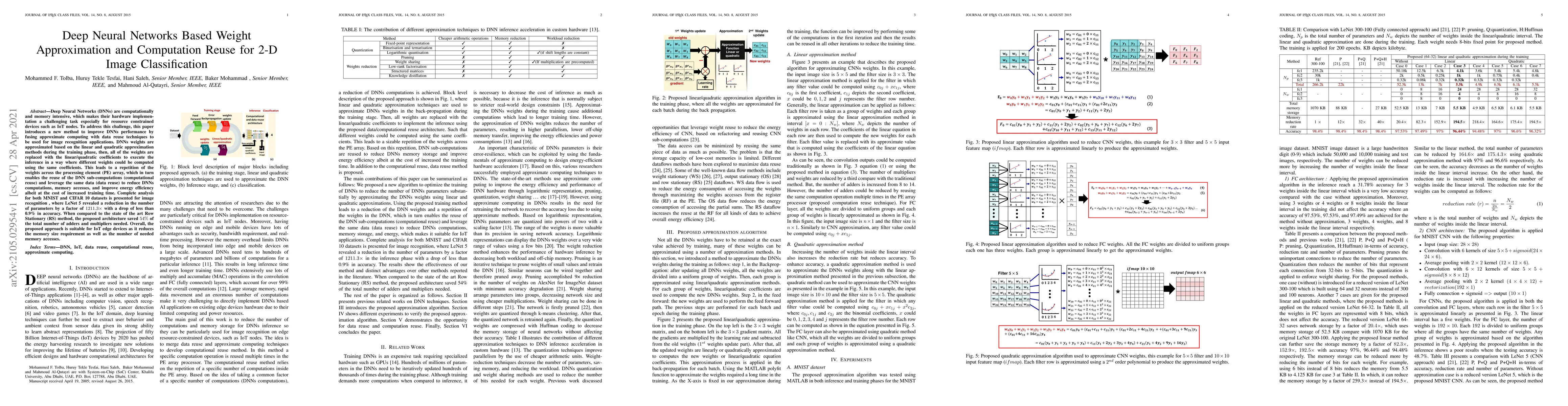 Deep Neural Networks (DNNs) are computationally and memory intensive, which makes their hardware implementation a challenging task especially for resource constrained devices such as IoT nodes. To address this challenge, this paper introduces a new method to improve DNNs performance by fusing approximate computing with data reuse techniques to be used for image recognition applications. DNNs weights are approximated based on the linear and quadratic approximation methods during the training phase, then, all of the weights are replaced with the linear/quadratic coefficients to execute the inference in a way where different weights could be computed using the same coefficients. This leads to a repetition of the weights across the processing element (PE) array, which in turn enables the reuse of the DNN sub-computations (computational reuse) and leverage the same data (data reuse) to reduce DNNs computations, memory accesses, and improve energy efficiency albeit at the cost of increased training time. Complete analysis for both MNIST and CIFAR 10 datasets is presented for image recognition , where LeNet 5 revealed a reduction in the number of parameters by a factor of 1211.3x with a drop of less than 0.9% in accuracy. When compared to the state of the art Row Stationary (RS) method, the proposed architecture saved 54% of the total number of adders and multipliers needed. Overall, the proposed approach is suitable for IoT edge devices as it reduces the memory size requirement as well as the number of needed memory accesses.