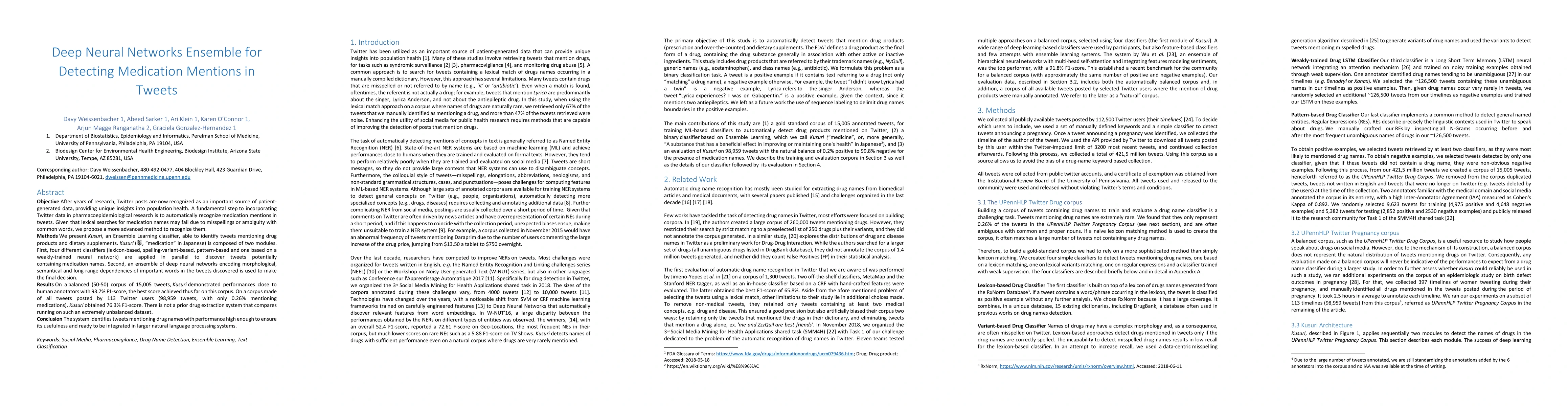 Kusuri, an ensemble learning classifier, effectively identifies medication mentions in tweets using a combination of four initial classifiers and deep neural networks, achieving a 93.7% F1-score on balanced data and demonstrating robust performance on highly unbalanced datasets.