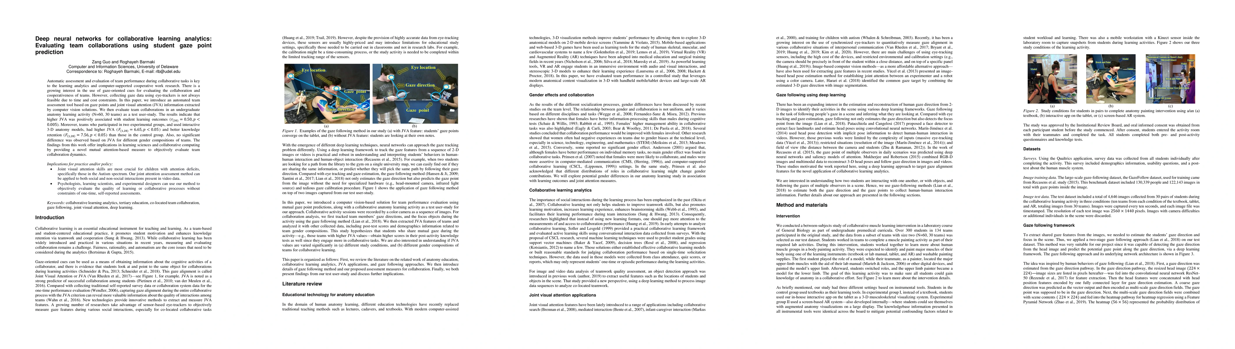 This paper proposes an automated tool using computer vision to predict gaze points and joint visual attention (JVA) for assessing team collaboration in collaborative learning tasks. Results from an undergraduate anatomy study show that higher JVA correlates with better learning outcomes, and teams using interactive 3-D models exhibited better JVA and knowledge retention compared to control groups.