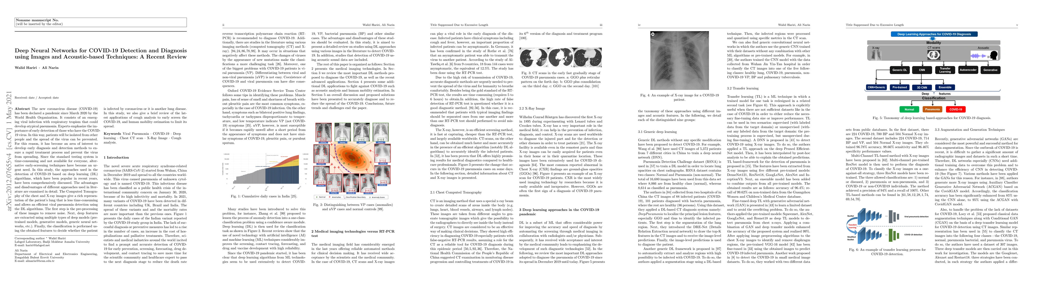 The new coronavirus disease (COVID-19) has been declared a pandemic since March 2020 by the World Health Organization. It consists of an emerging viral infection with respiratory tropism that could develop atypical pneumonia. Experts emphasize the importance of early detection of those who have the COVID-19 virus. In this way, patients will be isolated from other people and the spread of the virus can be prevented. For this reason, it has become an area of interest to develop early diagnosis and detection methods to ensure a rapid treatment process and prevent the virus from spreading. Since the standard testing system is time-consuming and not available for everyone, alternative early-screening techniques have become an urgent need. In this study, the approaches used in the detection of COVID-19 based on deep learning (DL) algorithms, which have been popular in recent years, have been comprehensively discussed. The advantages and disadvantages of different approaches used in literature are examined in detail. The Computed Tomography of the chest and X-ray images give a rich representation of the patient's lung that is less time-consuming and allows an efficient viral pneumonia detection using the DL algorithms. The first step is the pre-processing of these images to remove noise. Next, deep features are extracted using multiple types of deep models (pre-trained models, generative models, generic neural networks, etc.). Finally, the classification is performed using the obtained features to decide whether the patient is infected by coronavirus or it is another lung disease. In this study, we also give a brief review of the latest applications of cough analysis to early screen the COVID-19, and human mobility estimation to limit its spread.