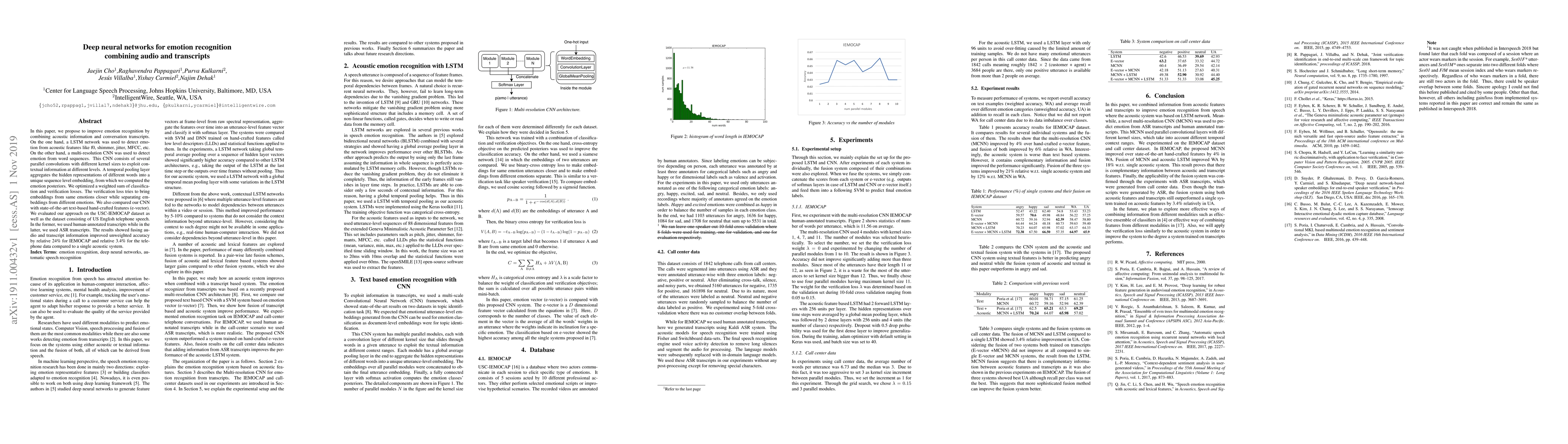 In this paper, we propose to improve emotion recognition by combining acoustic information and conversation transcripts. On the one hand, an LSTM network was used to detect emotion from acoustic features like f0, shimmer, jitter, MFCC, etc. On the other hand, a multi-resolution CNN was used to detect emotion from word sequences. This CNN consists of several parallel convolutions with different kernel sizes to exploit contextual information at different levels. A temporal pooling layer aggregates the hidden representations of different words into a unique sequence level embedding, from which we computed the emotion posteriors. We optimized a weighted sum of classification and verification losses. The verification loss tries to bring embeddings from the same emotions closer while separating embeddings from different emotions. We also compared our CNN with state-of-the-art text-based hand-crafted features (e-vector). We evaluated our approach on the USC-IEMOCAP dataset as well as the dataset consisting of US English telephone speech. In the former, we used human-annotated transcripts while in the latter, we used ASR transcripts. The results showed fusing audio and transcript information improved unweighted accuracy by relative 24% for IEMOCAP and relative 3.4% for the telephone data compared to a single acoustic system.