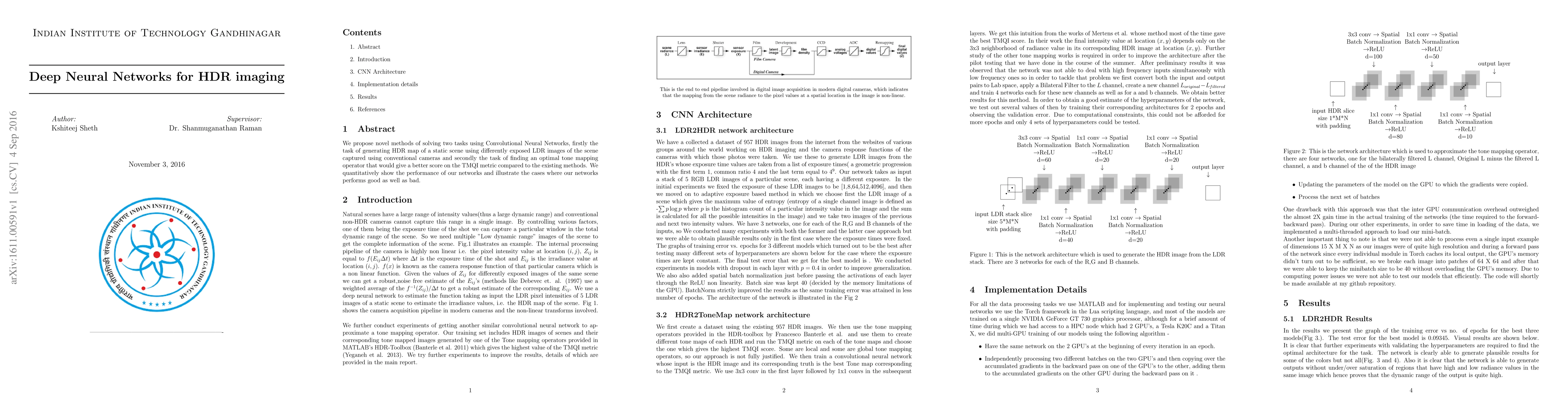 We propose novel methods of solving two tasks using Convolutional Neural Networks, firstly the task of generating HDR map of a static scene using differently exposed LDR images of the scene captured using conventional cameras and secondly the task of finding an optimal tone mapping operator that would give a better score on the TMQI metric compared to the existing methods. We quantitatively show the performance of our networks and illustrate the cases where our networks performs good as well as bad.