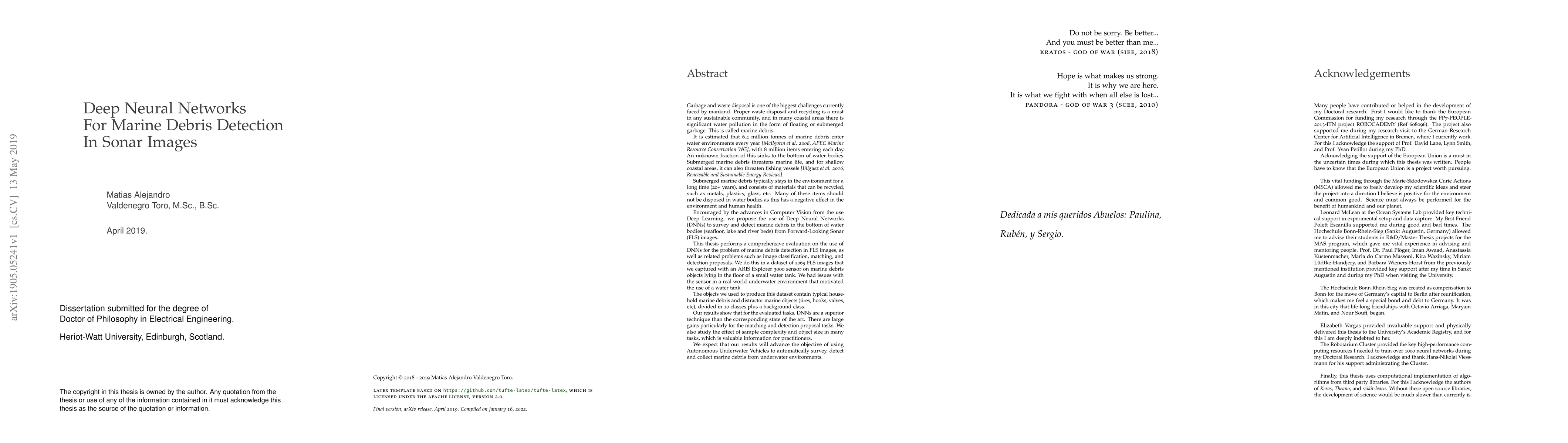 Garbage and waste disposal is one of the biggest challenges currently faced by mankind. Proper waste disposal and recycling is a must in any sustainable community, and in many coastal areas there is significant water pollution in the form of floating or submerged garbage. This is called marine debris. Submerged marine debris threatens marine life, and for shallow coastal areas, it can also threaten fishing vessels [I\~niguez et al. 2016, Renewable and Sustainable Energy Reviews]. Submerged marine debris typically stays in the environment for a long time (20+ years), and consists of materials that can be recycled, such as metals, plastics, glass, etc. Many of these items should not be disposed in water bodies as this has a negative effect in the environment and human health. This thesis performs a comprehensive evaluation on the use of DNNs for the problem of marine debris detection in FLS images, as well as related problems such as image classification, matching, and detection proposals. We do this in a dataset of 2069 FLS images that we captured with an ARIS Explorer 3000 sensor on marine debris objects lying in the floor of a small water tank. The objects we used to produce this dataset contain typical household marine debris and distractor marine objects (tires, hooks, valves, etc), divided in 10 classes plus a background class. Our results show that for the evaluated tasks, DNNs are a superior technique than the corresponding state of the art. There are large gains particularly for the matching and detection proposal tasks. We also study the effect of sample complexity and object size in many tasks, which is valuable information for practitioners. We expect that our results will advance the objective of using Autonomous Underwater Vehicles to automatically survey, detect and collect marine debris from underwater environments.