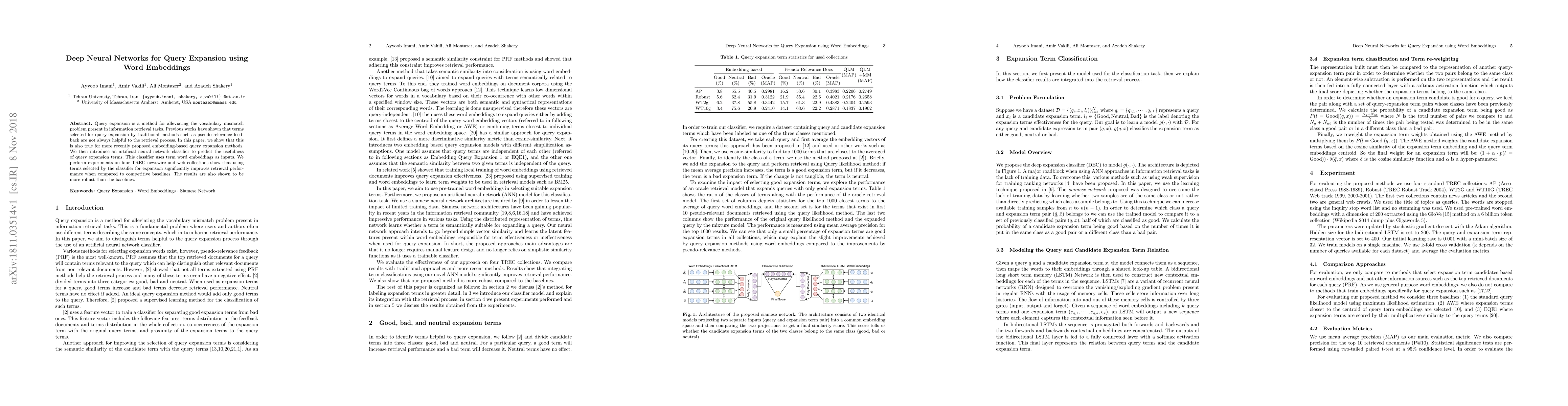 This paper proposes a deep neural network classifier to predict the usefulness of query expansion terms using word embeddings, demonstrating improved and more robust retrieval performance over traditional and embedding-based methods in TREC newswire and web collections.