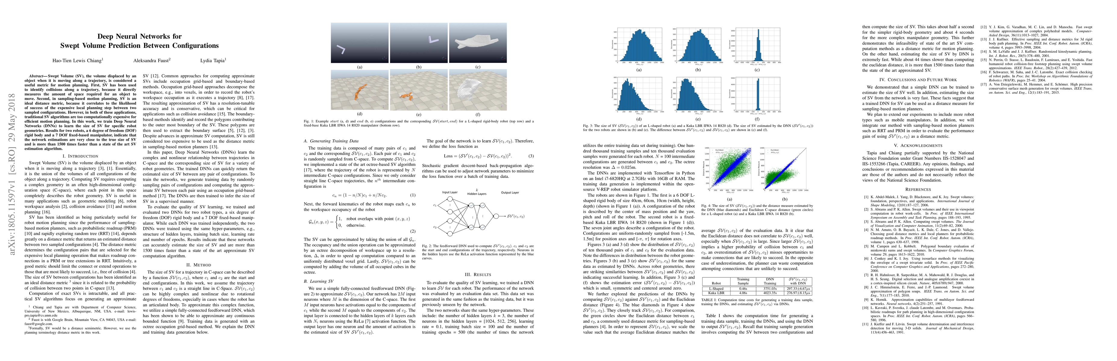 Swept Volume (SV), the volume displaced by an object when it is moving along a trajectory, is considered a useful metric for motion planning. First, SV has been used to identify collisions along a trajectory, because it directly measures the amount of space required for an object to move. Second, in sampling-based motion planning, SV is an ideal distance metric, because it correlates to the likelihood of success of the expensive local planning step between two sampled configurations. However, in both of these applications, traditional SV algorithms are too computationally expensive for efficient motion planning. In this work, we train Deep Neural Networks (DNNs) to learn the size of SV for specific robot geometries. Results for two robots, a 6 degree of freedom (DOF) rigid body and a 7 DOF fixed-based manipulator, indicate that the network estimations are very close to the true size of SV and is more than 1500 times faster than a state of the art SV estimation algorithm.
