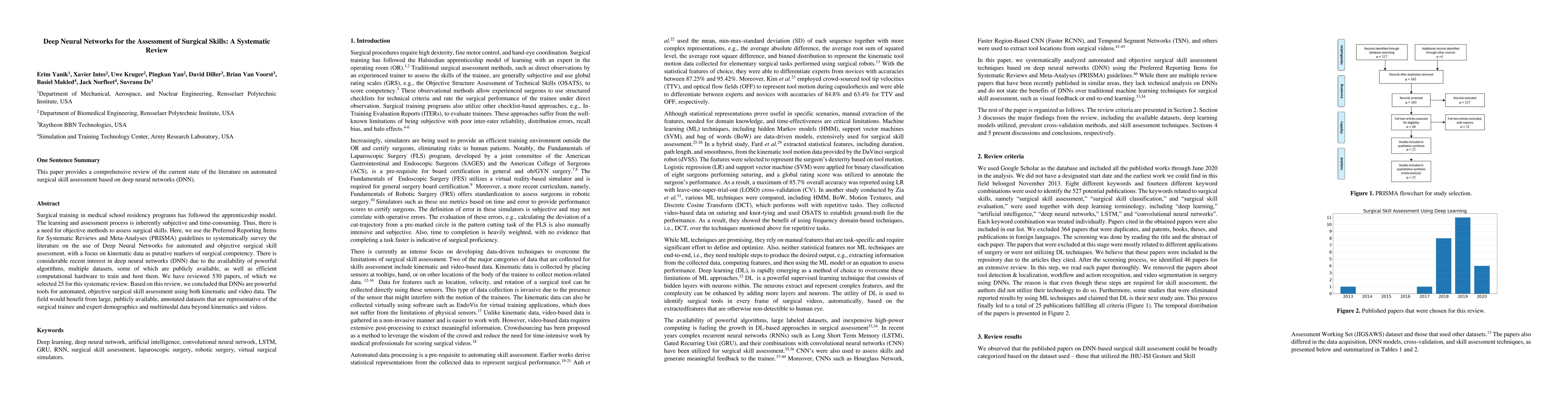 Surgical training in medical school residency programs has followed the apprenticeship model. The learning and assessment process is inherently subjective and time-consuming. Thus, there is a need for objective methods to assess surgical skills. Here, we use the Preferred Reporting Items for Systematic Reviews and Meta-Analyses (PRISMA) guidelines to systematically survey the literature on the use of Deep Neural Networks for automated and objective surgical skill assessment, with a focus on kinematic data as putative markers of surgical competency. There is considerable recent interest in deep neural networks (DNN) due to the availability of powerful algorithms, multiple datasets, some of which are publicly available, as well as efficient computational hardware to train and host them. We have reviewed 530 papers, of which we selected 25 for this systematic review. Based on this review, we concluded that DNNs are powerful tools for automated, objective surgical skill assessment using both kinematic and video data. The field would benefit from large, publicly available, annotated datasets that are representative of the surgical trainee and expert demographics and multimodal data beyond kinematics and videos.
