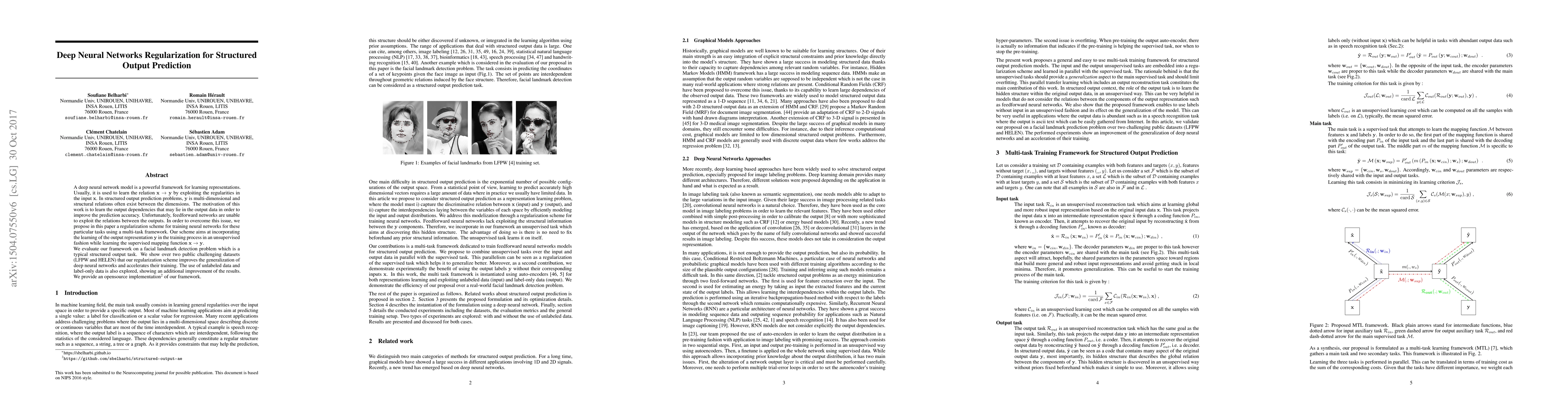 A deep neural network model is a powerful framework for learning representations. Usually, it is used to learn the relation $x \to y$ by exploiting the regularities in the input $x$. In structured output prediction problems, $y$ is multi-dimensional and structural relations often exist between the dimensions. The motivation of this work is to learn the output dependencies that may lie in the output data in order to improve the prediction accuracy. Unfortunately, feedforward networks are unable to exploit the relations between the outputs. In order to overcome this issue, we propose in this paper a regularization scheme for training neural networks for these particular tasks using a multi-task framework. Our scheme aims at incorporating the learning of the output representation $y$ in the training process in an unsupervised fashion while learning the supervised mapping function $x \to y$. We evaluate our framework on a facial landmark detection problem which is a typical structured output task. We show over two public challenging datasets (LFPW and HELEN) that our regularization scheme improves the generalization of deep neural networks and accelerates their training. The use of unlabeled data and label-only data is also explored, showing an additional improvement of the results. We provide an opensource implementation (https://github.com/sbelharbi/structured-output-ae) of our framework.