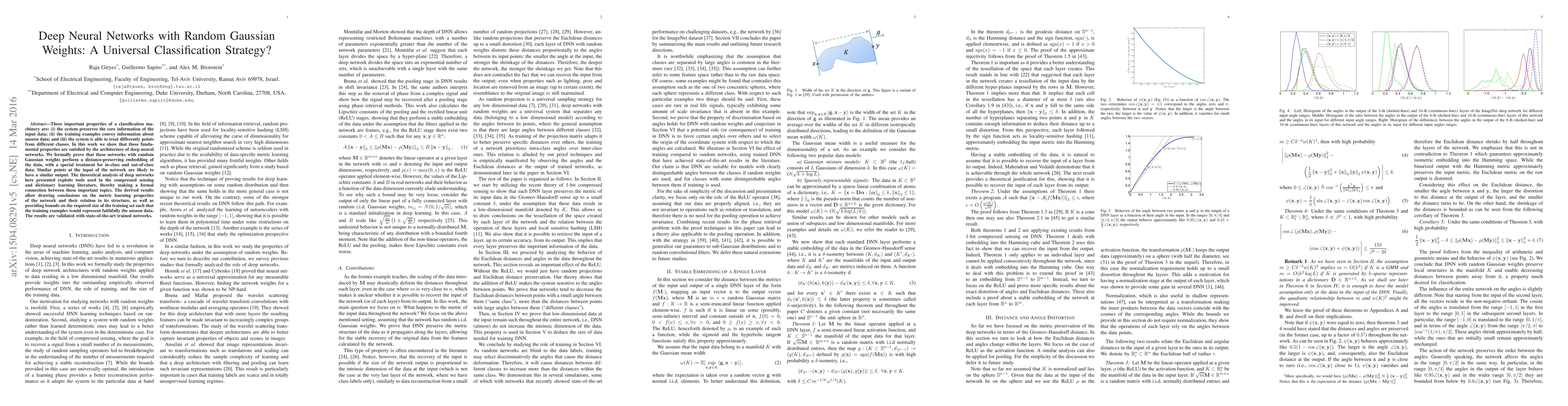 Three important properties of a classification machinery are: (i) the system preserves the core information of the input data; (ii) the training examples convey information about unseen data; and (iii) the system is able to treat differently points from different classes. In this work we show that these fundamental properties are satisfied by the architecture of deep neural networks. We formally prove that these networks with random Gaussian weights perform a distance-preserving embedding of the data, with a special treatment for in-class and out-of-class data. Similar points at the input of the network are likely to have a similar output. The theoretical analysis of deep networks here presented exploits tools used in the compressed sensing and dictionary learning literature, thereby making a formal connection between these important topics. The derived results allow drawing conclusions on the metric learning properties of the network and their relation to its structure, as well as providing bounds on the required size of the training set such that the training examples would represent faithfully the unseen data. The results are validated with state-of-the-art trained networks.
