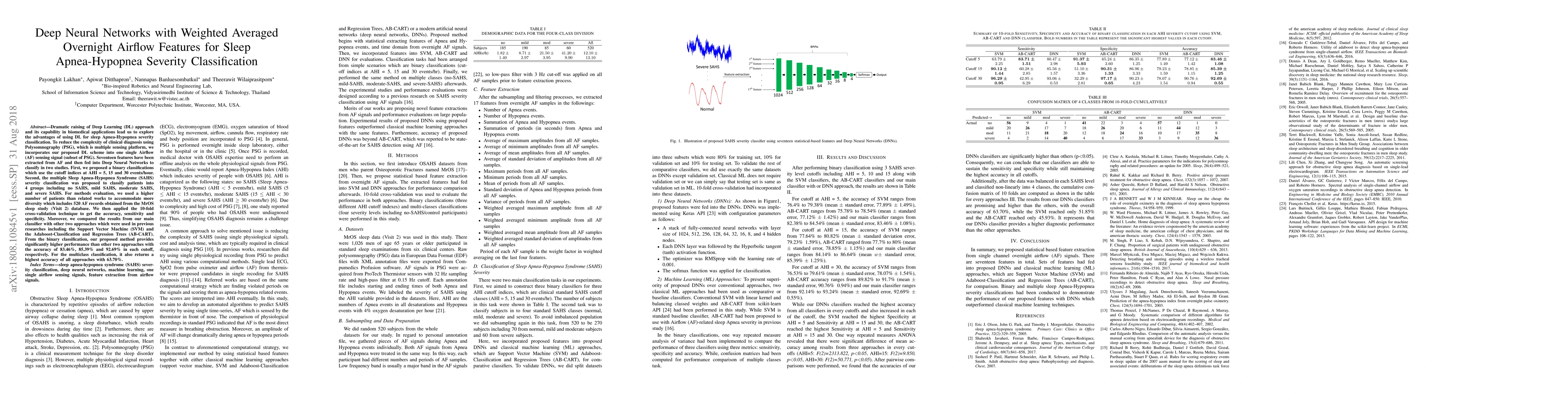Dramatic raising of Deep Learning (DL) approach and its capability in biomedical applications lead us to explore the advantages of using DL for sleep Apnea-Hypopnea severity classification. To reduce the complexity of clinical diagnosis using Polysomnography (PSG), which is multiple sensing platform, we incorporates our proposed DL scheme into one single Airflow (AF) sensing signal (subset of PSG). Seventeen features have been extracted from AF and then fed into Deep Neural Networks to classify in two studies. First, we proposed a binary classifications which use the cutoff indices at AHI = 5, 15 and 30 events/hour. Second, the multiple Sleep Apnea-Hypopnea Syndrome (SAHS) severity classification was proposed to classify patients into 4 groups including no SAHS, mild SAHS, moderate SAHS, and severe SAHS. For methods evaluation, we used a higher number of patients than related works to accommodate more diversity which includes 520 AF records obtained from the MrOS sleep study (Visit 2) database. We then applied the 10-fold cross-validation technique to get the accuracy, sensitivity and specificity. Moreover, we compared the results from our main classifier with other two approaches which were used in previous researches including the Support Vector Machine (SVM) and the Adaboost-Classification and Regression Trees (AB-CART). From the binary classification, our proposed method provides significantly higher performance than other two approaches with the accuracy of 83.46 %, 85.39 % and 92.69 % in each cutoff, respectively. For the multiclass classification, it also returns a highest accuracy of all approaches with 63.70 %.