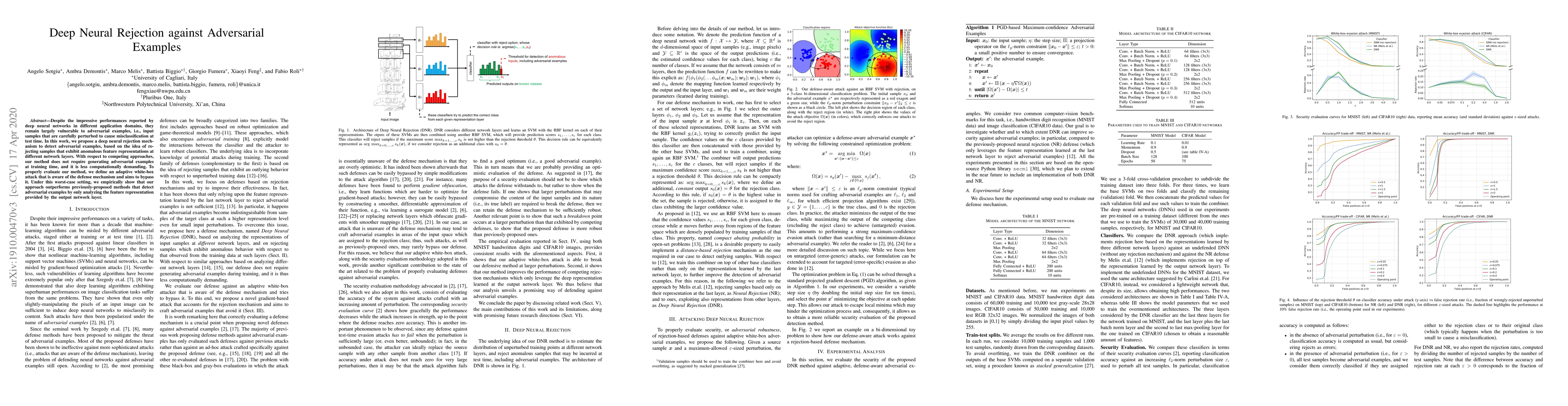 This paper proposes a deep neural rejection mechanism to detect adversarial examples without training on adversarial samples, focusing on anomalous feature representations across network layers. It outperforms existing methods under an adaptive white-box attack designed to bypass conventional defenses.