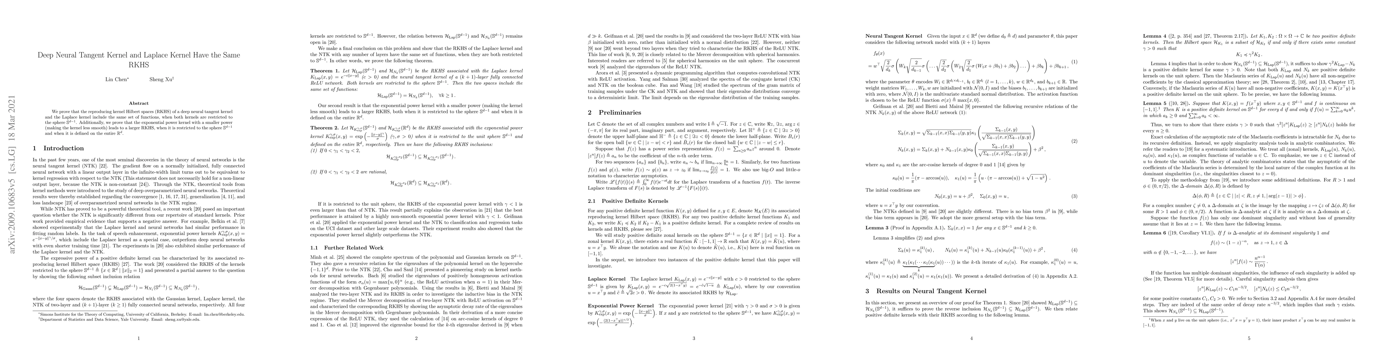 The paper establishes that the RKHS of deep neural tangent kernels and Laplace kernels are equivalent on the sphere $\mathbb{S}^{d-1}$ and compares the sizes of RKHSs for exponential power kernels with varying smoothness.