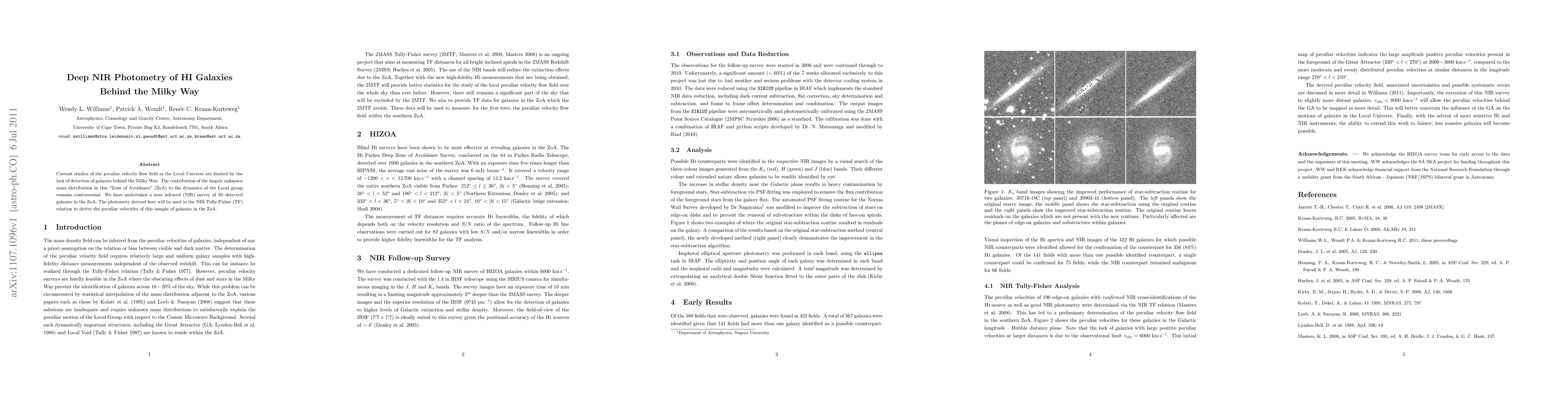 This research conducted a near-infrared (NIR) photometry survey of HI detected galaxies obscured by the Milky Way, intending to utilize the NIR Tully-Fisher relation for deriving peculiar velocities. The study aims to address the controversy surrounding the unknown mass distribution in the 'Zone of Avoidance' and its impact on Local Group dynamics.