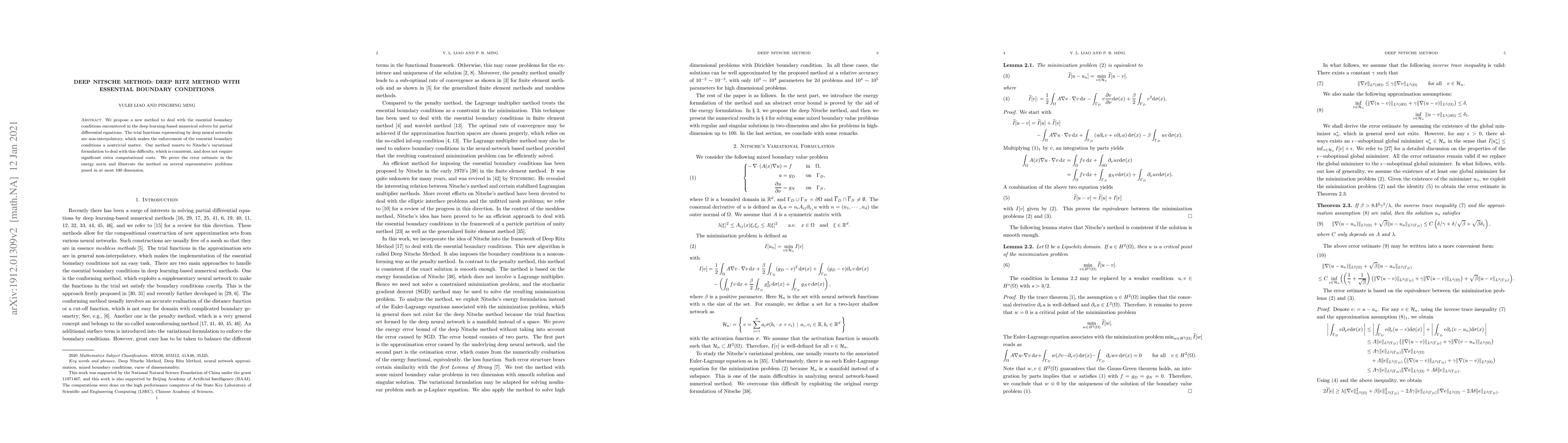 This paper introduces the Deep Nitsche Method, a novel approach to enforce essential boundary conditions in deep learning-based solvers for partial differential equations. It uses Nitsche's variational formulation to address the challenge without significant extra computational costs, and demonstrates its effectiveness through error estimates and problem illustrations.
