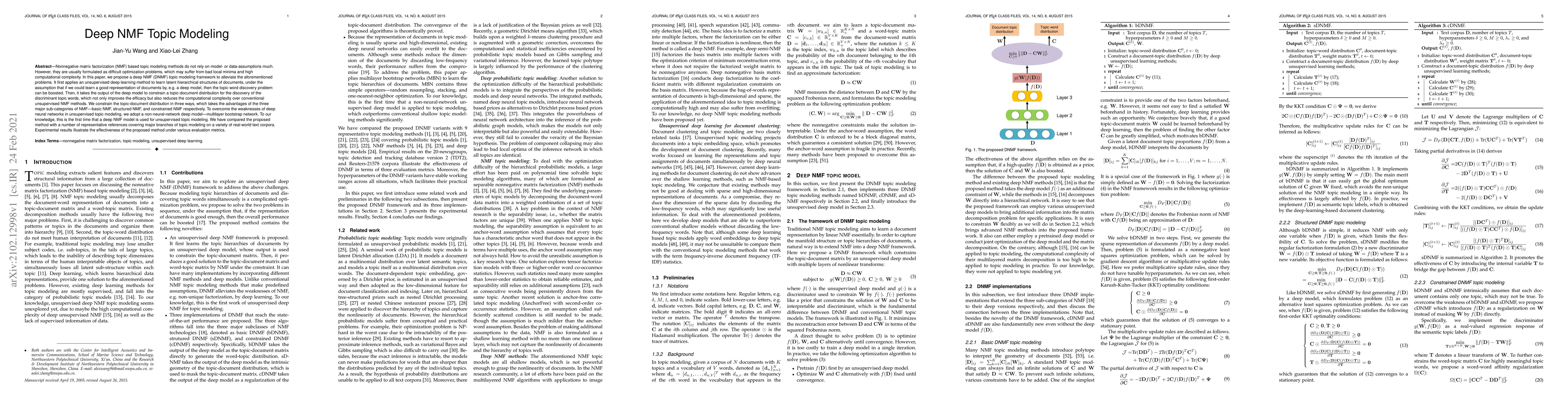 This paper introduces a deep NMF (DNMF) framework for topic modeling that leverages unsupervised deep learning to learn document structures and constrains topic-document distributions to improve efficiency and reduce computational complexity. The proposed multilayer bootstrap network, a non-neural-network deep model, addresses the weaknesses of traditional deep neural networks in unsupervised modeling, demonstrating effectiveness through comparisons with other topic modeling methods.