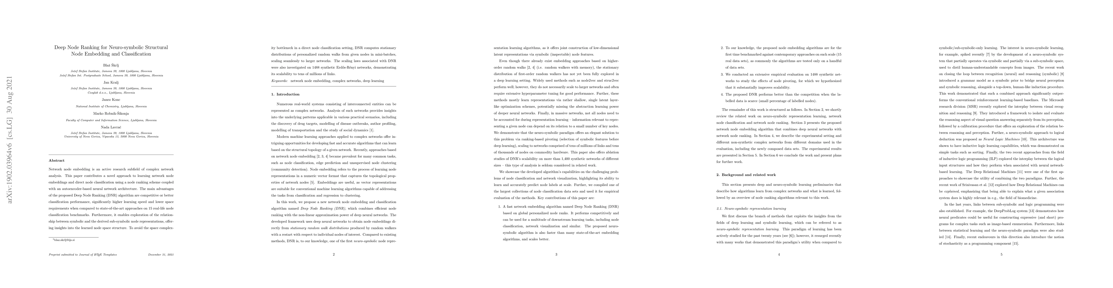 Network node embedding is an active research subfield of complex network analysis. This paper contributes a novel approach to learning network node embeddings and direct node classification using a node ranking scheme coupled with an autoencoder-based neural network architecture. The main advantages of the proposed Deep Node Ranking (DNR) algorithm are competitive or better classification performance, significantly higher learning speed and lower space requirements when compared to state-of-the-art approaches on 15 real-life node classification benchmarks. Furthermore, it enables exploration of the relationship between symbolic and the derived sub-symbolic node representations, offering insights into the learned node space structure. To avoid the space complexity bottleneck in a direct node classification setting, DNR computes stationary distributions of personalized random walks from given nodes in mini-batches, scaling seamlessly to larger networks. The scaling laws associated with DNR were also investigated on 1488 synthetic Erd\H{o}s-R\'enyi networks, demonstrating its scalability to tens of millions of links.