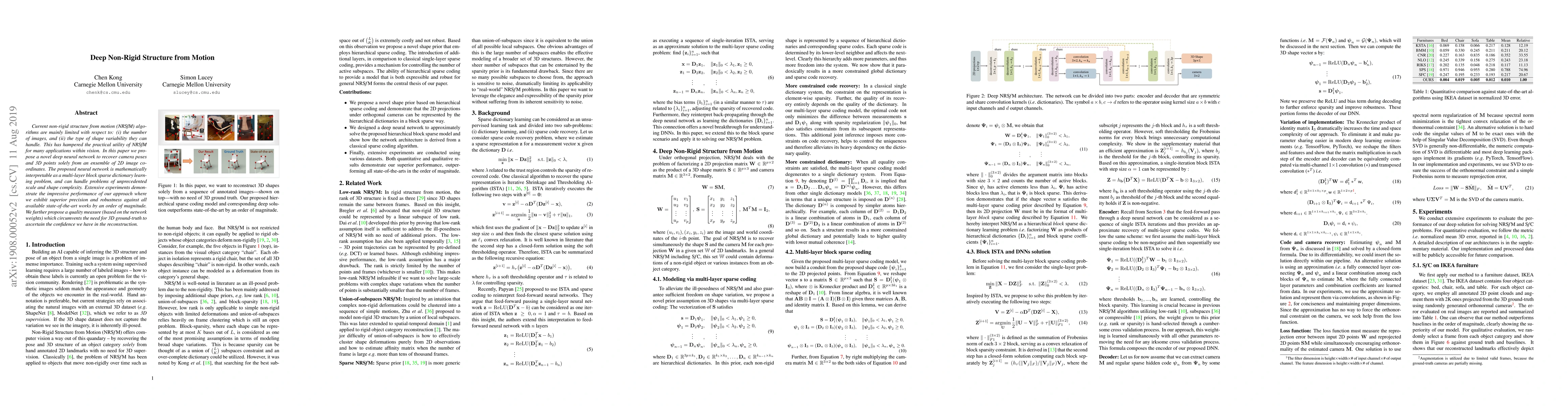 Current non-rigid structure from motion (NRSfM) algorithms are mainly limited with respect to: (i) the number of images, and (ii) the type of shape variability they can handle. This has hampered the practical utility of NRSfM for many applications within vision. In this paper we propose a novel deep neural network to recover camera poses and 3D points solely from an ensemble of 2D image coordinates. The proposed neural network is mathematically interpretable as a multi-layer block sparse dictionary learning problem, and can handle problems of unprecedented scale and shape complexity. Extensive experiments demonstrate the impressive performance of our approach where we exhibit superior precision and robustness against all available state-of-the-art works in the order of magnitude. We further propose a quality measure (based on the network weights) which circumvents the need for 3D ground-truth to ascertain the confidence we have in the reconstruction.