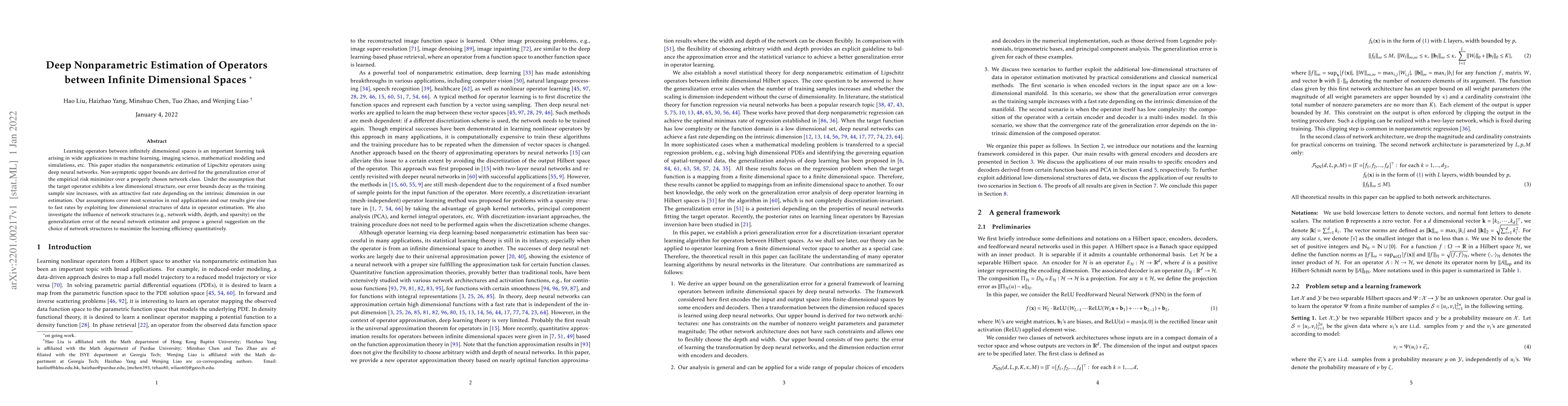 This paper explores nonparametric estimation of Lipschitz operators between infinite-dimensional spaces using deep neural networks, deriving non-asymptotic upper bounds for generalization error. It demonstrates fast decay rates in error bounds based on the intrinsic dimension, and provides insights into optimal network structures to enhance learning efficiency.