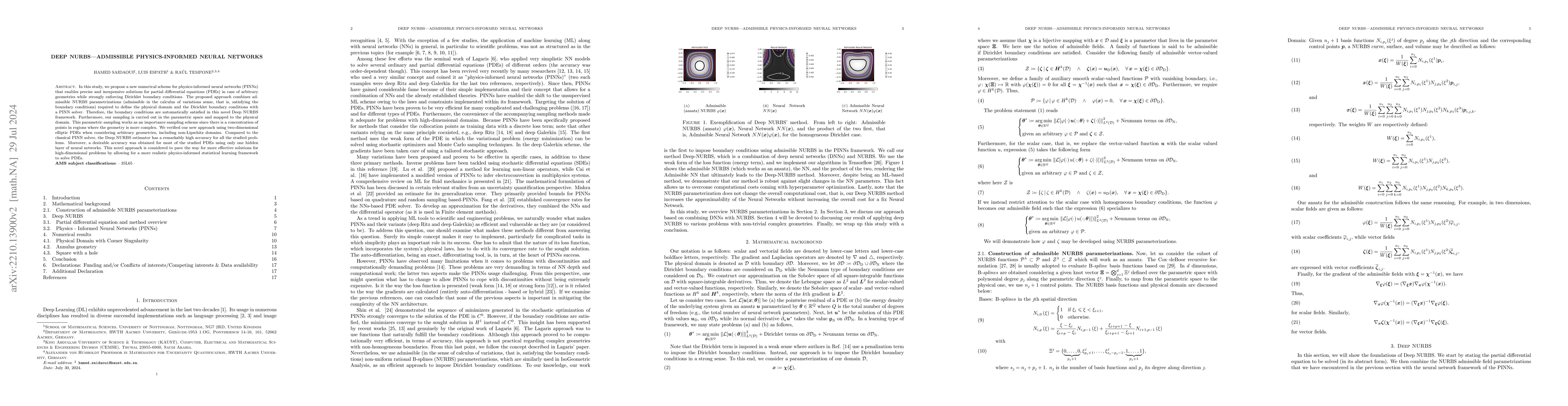 In this study, we propose a new numerical scheme for physics-informed neural networks (PINNs) that enables precise and inexpensive solution for partial differential equations (PDEs) in case of arbitrary geometries while strictly enforcing Dirichlet boundary conditions. The proposed approach combines admissible NURBS parametrizations required to define the physical domain and the Dirichlet boundary conditions with a PINN solver. The fundamental boundary conditions are automatically satisfied in this novel Deep NURBS framework. We verified our new approach using two-dimensional elliptic PDEs when considering arbitrary geometries, including non-Lipschitz domains. Compared to the classical PINN solver, the Deep NURBS estimator has a remarkably high convergence rate for all the studied problems. Moreover, a desirable accuracy was realized for most of the studied PDEs using only one hidden layer of neural networks. This novel approach is considered to pave the way for more effective solutions for high-dimensional problems by allowing for more realistic physics-informed statistical learning to solve PDE-based variational problems.