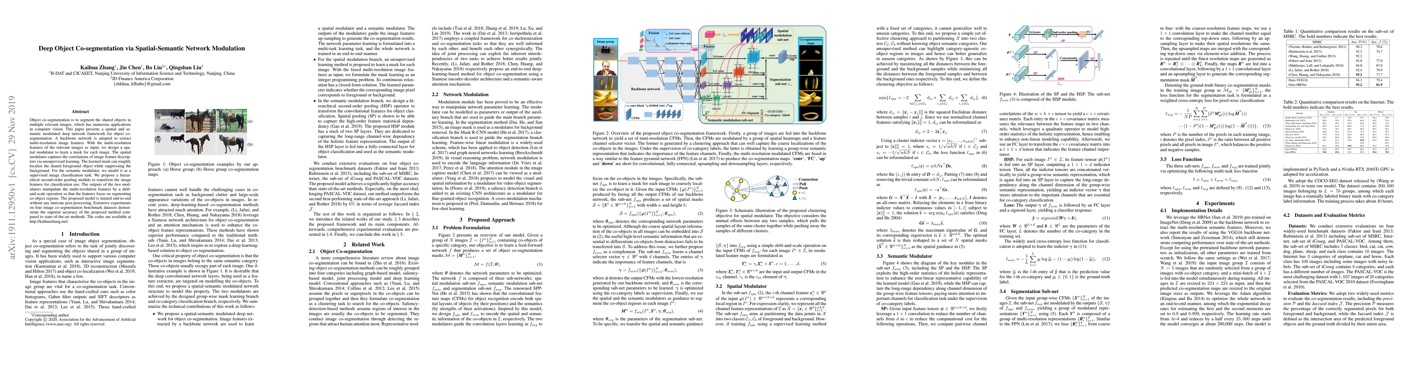 This paper introduces a deep network framework for object co-segmentation using spatial and semantic modulation. It employs a backbone network for feature extraction, spatial and semantic modulators to refine segmentation masks, and achieves superior accuracy on benchmark datasets compared to existing methods.
