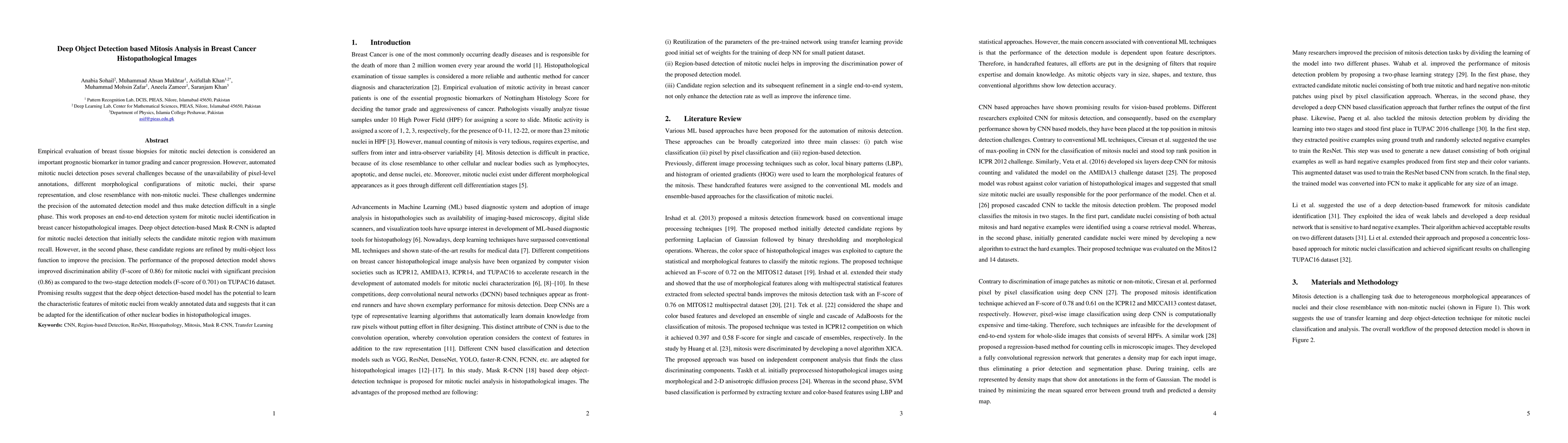 Empirical evaluation of breast tissue biopsies for mitotic nuclei detection is considered an important prognostic biomarker in tumor grading and cancer progression. However, automated mitotic nuclei detection poses several challenges because of the unavailability of pixel-level annotations, different morphological configurations of mitotic nuclei, their sparse representation, and close resemblance with non-mitotic nuclei. These challenges undermine the precision of the automated detection model and thus make detection difficult in a single phase. This work proposes an end-to-end detection system for mitotic nuclei identification in breast cancer histopathological images. Deep object detection-based Mask R-CNN is adapted for mitotic nuclei detection that initially selects the candidate mitotic region with maximum recall. However, in the second phase, these candidate regions are refined by multi-object loss function to improve the precision. The performance of the proposed detection model shows improved discrimination ability (F-score of 0.86) for mitotic nuclei with significant precision (0.86) as compared to the two-stage detection models (F-score of 0.701) on TUPAC16 dataset. Promising results suggest that the deep object detection-based model has the potential to learn the characteristic features of mitotic nuclei from weakly annotated data and suggests that it can be adapted for the identification of other nuclear bodies in histopathological images.