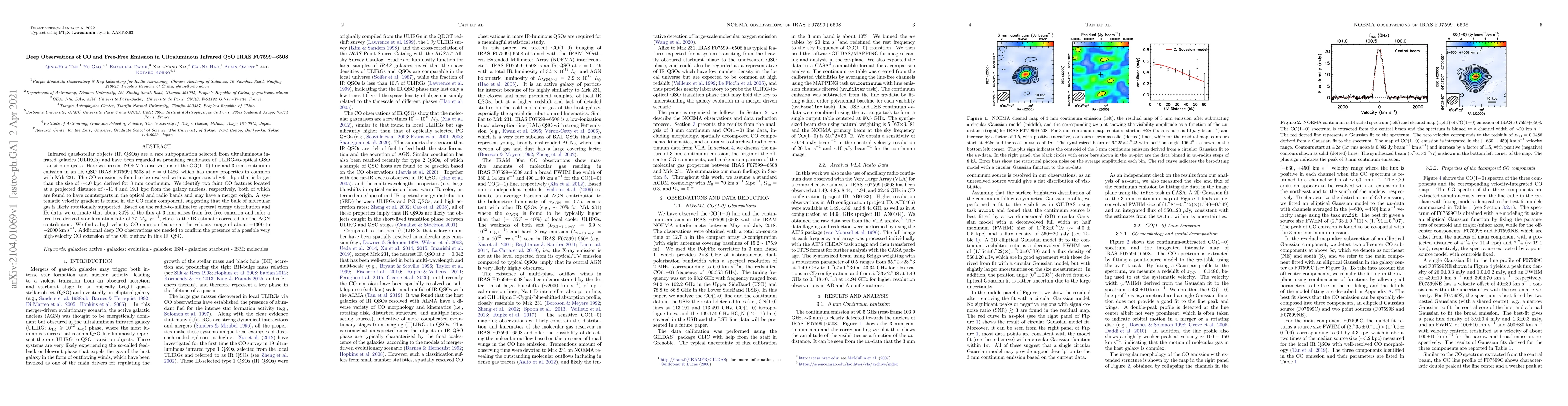 Infrared quasi-stellar objects (IR QSOs) are a rare subpopulation selected from ultraluminous infrared galaxies (ULIRGs) and have been regarded as promising candidates of ULIRG-to-optical QSO transition objects. Here we present NOEMA observations of the CO(1-0) line and 3 mm continuum emission in an IR QSO IRAS F07599+6508 at $z=0.1486$, which has many properties in common with Mrk 231. The CO emission is found to be resolved with a major axis of $\sim$6.1 kpc that is larger than the size of $\sim$4.0 kpc derived for 3 mm continuum. We identify two faint CO features located at a projected distance of $\sim$11.4 and 19.1 kpc from the galaxy nucleus, respectively, both of which are found to have counterparts in the optical and radio bands and may have a merger origin. A systematic velocity gradient is found in the CO main component, suggesting that the bulk of molecular gas is likely rotationally supported. Based on the radio-to-millimeter spectral energy distribution and IR data, we estimate that about 30$\%$ of the flux at 3 mm arises from free-free emission and infer a free-free-derived star formation rate of 77 $M_\odot\ {\rm yr^{-1}}$, close to the IR estimate corrected for the AGN contribution. We find a high-velocity CO emission feature at the velocity range of about -1300 to -2000 km s$^{-1}$. Additional deep CO observations are needed to confirm the presence of a possible very high-velocity CO extension of the OH outflow in this IR QSO.