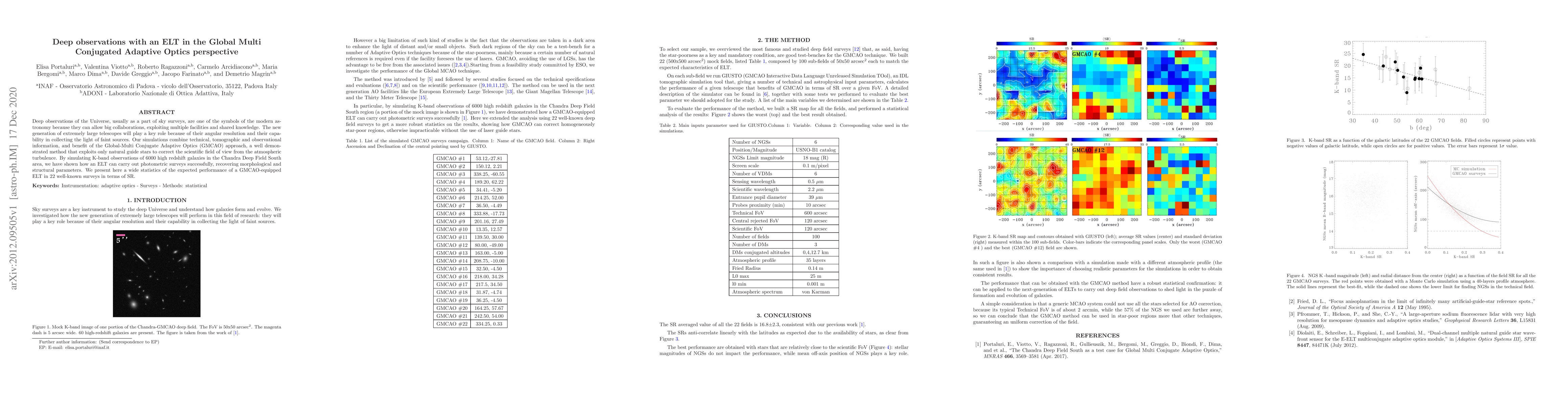 Deep observations of the Universe, usually as a part of sky surveys, are one of the symbols of the modern astronomy because they can allow big collaborations, exploiting multiple facilities and shared knowledge. The new generation of extremely large telescopes will play a key role because of their angular resolution and their capability in collecting the light of faint sources. Our simulations combine technical, tomographic and observational information, and benefit of the Global-Multi Conjugate Adaptive Optics (GMCAO) approach, a well demonstrated method that exploits only natural guide stars to correct the scientific field of view from the atmospheric turbulence. By simulating K-band observations of 6000 high redshift galaxies in the Chandra Deep Field South area, we have shown how an ELT can carry out photometric surveys successfully, recovering morphological and structural parameters. We present here a wide statistics of the expected performance of a GMCAO-equipped ELT in 22 well-known surveys in terms of SR.