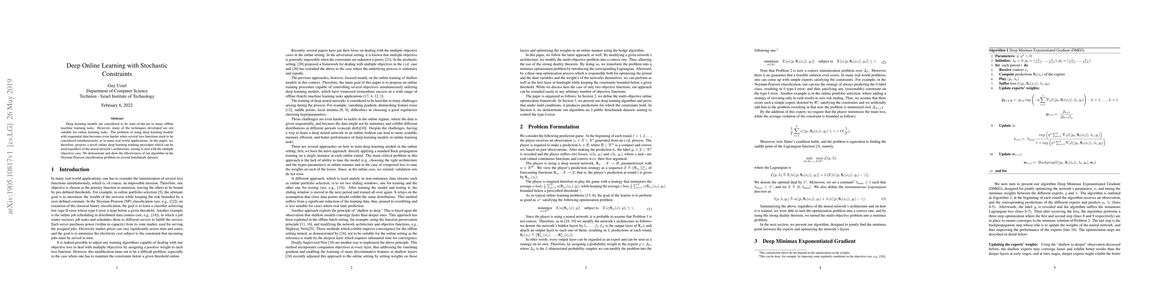 This paper proposes a novel online training procedure for deep learning models to handle sequential data and multiple loss functions simultaneously, demonstrating effectiveness on the Neyman-Pearson classification problem across various benchmark datasets. The method is architecture-agnostic and aims to address the challenges of online learning with stochastic constraints.