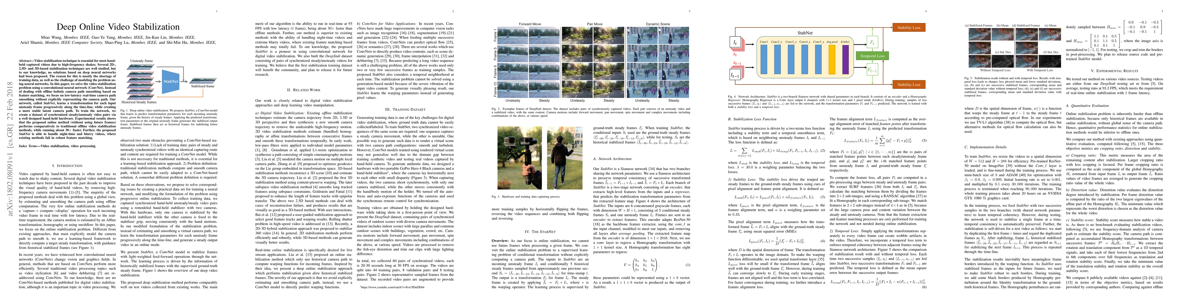 This paper proposes StabNet, a convolutional neural network for real-time online video stabilization, addressing the lack of deep learning solutions for this problem. The network learns frame-by-frame transformations to smooth out camera shakes, achieving comparable results to traditional methods while running 30 times faster.