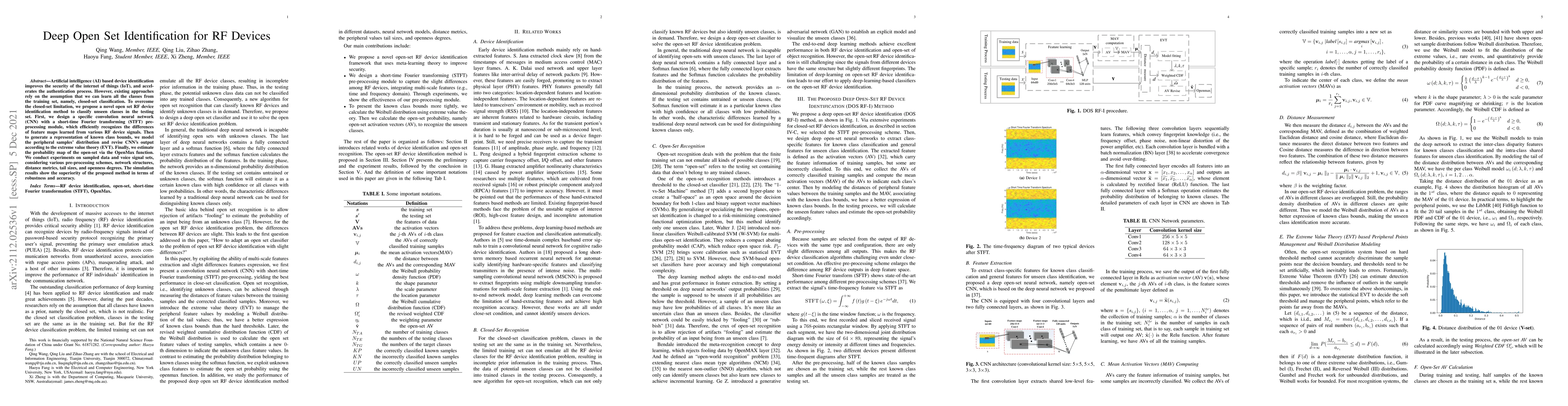 This paper proposes a novel open set RF device identification method using a CNN with STFT pre-processing to classify unseen classes. The OpenMax function is used to estimate known class bounds, demonstrating improved robustness and accuracy in experiments.