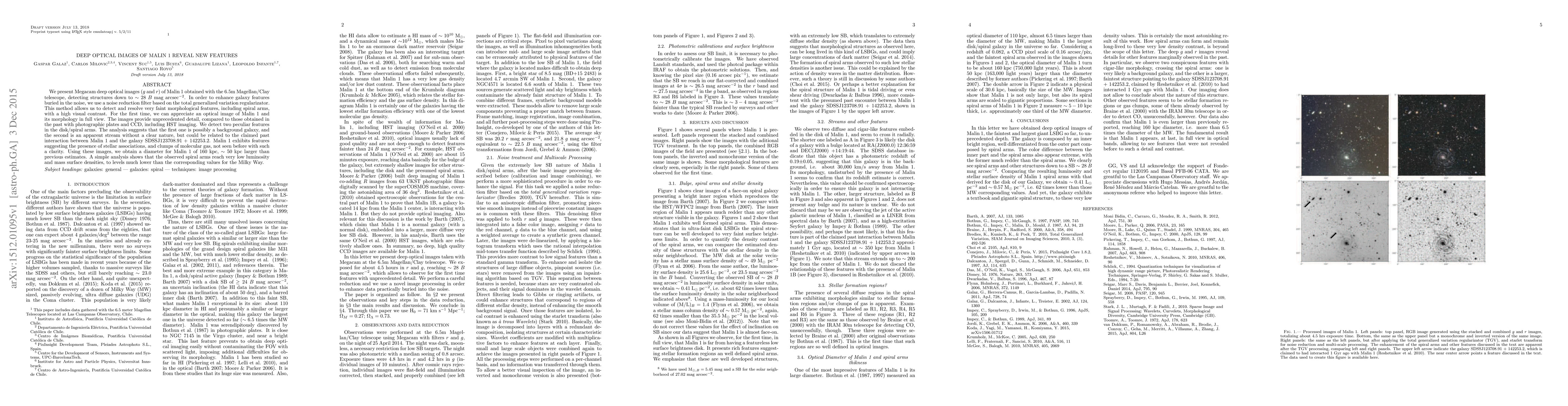This study utilizes deep optical images of Malin 1 from the Magellan/Clay telescope to reveal unprecedented morphological details, including spiral arms and faint features, employing a noise reduction filter. The analysis identifies new structures, suggesting a larger diameter and lower luminosity and mass surface densities in the spiral arms compared to the Milky Way.