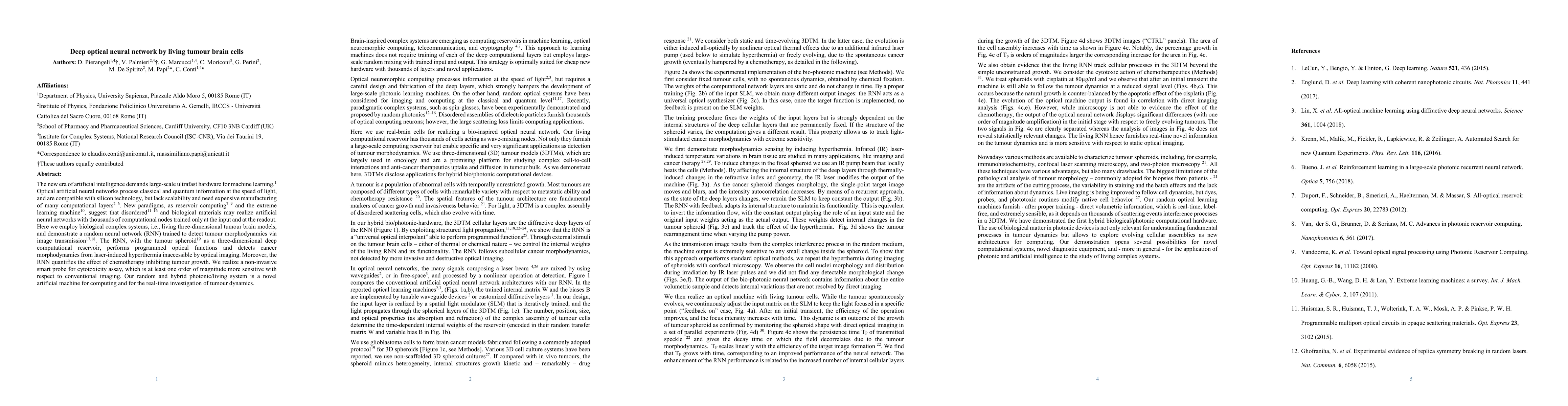 The new era of artificial intelligence demands large-scale ultrafast hardware for machine learning. Optical artificial neural networks process classical and quantum information at the speed of light, and are compatible with silicon technology, but lack scalability and need expensive manufacturing of many computational layers. New paradigms, as reservoir computing and the extreme learning machine, suggest that disordered and biological materials may realize artificial neural networks with thousands of computational nodes trained only at the input and at the readout. Here we employ biological complex systems, i.e., living three-dimensional tumour brain models, and demonstrate a random neural network (RNN) trained to detect tumour morphodynamics via image transmission. The RNN, with the tumour spheroid as a three-dimensional deep computational reservoir, performs programmed optical functions and detects cancer morphodynamics from laser-induced hyperthermia inaccessible by optical imaging. Moreover, the RNN quantifies the effect of chemotherapy inhibiting tumour growth. We realize a non-invasive smart probe for cytotoxicity assay, which is at least one order of magnitude more sensitive with respect to conventional imaging. Our random and hybrid photonic/living system is a novel artificial machine for computing and for the real-time investigation of tumour dynamics.