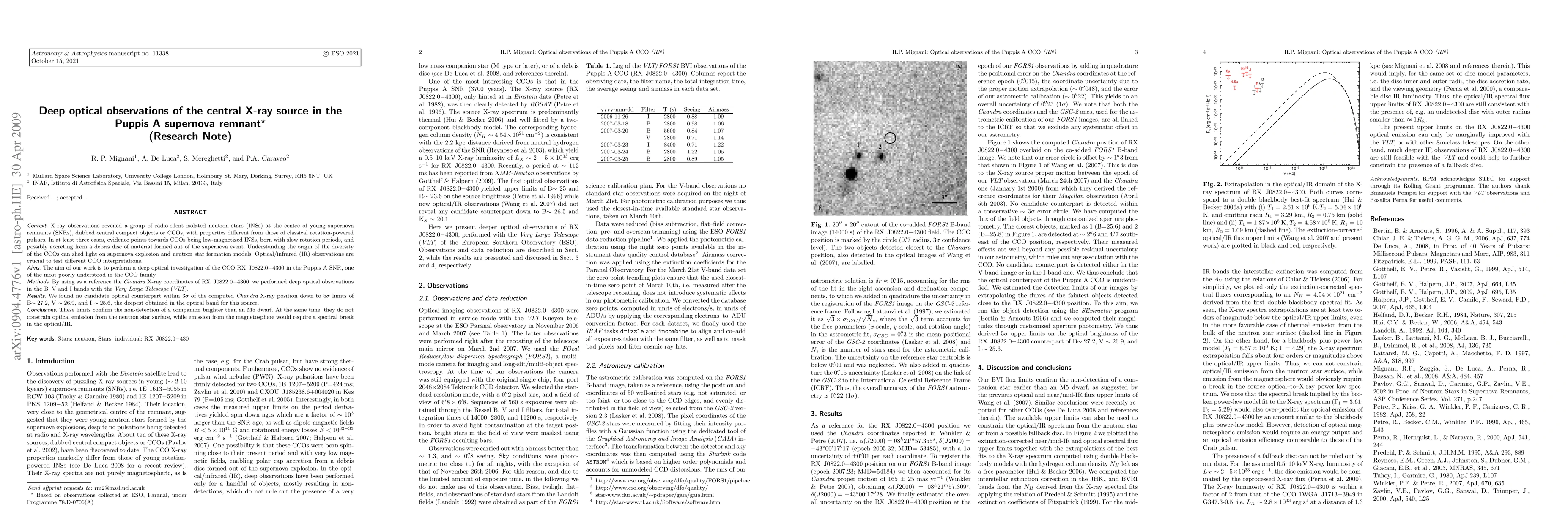 X-ray observations reveiled a group of radio-silent isolated neutron stars (INSs) at the centre of young supernova remnants (SNRs), dubbed central compact objects or CCOs, with properties different from those of classical rotation-powered pulsars. In at least three cases, evidence points towards CCOs being low-magnetized INSs, born with slow rotation periods, and possibly accreting from a debris disc of material formed out of the supernova event. Understanding the origin of the diversity of the CCOs can shed light on supernova explosion and neutron star formation models. Optical/infrared (IR) observations are crucial to test different CCO interpretations. The aim of our work is to perform a deep optical investigation of the CCO RX J0822.0-4300 in the Puppis A SNR, one of the most poorly understood in the CCO family. By using as a reference the Chandra X-ray coordinates of RX J0822.0-4300, we performed deep optical observations in the B, V and I bands with the Very Large Telescope (VLT). We found no candidate optical counterpart within 3 sigma of the computed Chandra X-ray position down to 5 sigma limits of B~27.2, V~26.9, and I~25.6, the deepest obtained in the optical band for this source. These limits confirm the non-detection of a companion brighter than an M5 dwarf. At the same time, they do not constrain optical emission from the neutron star surface, while emission from the magnetosphere would require a spectral break in the optical/IR.