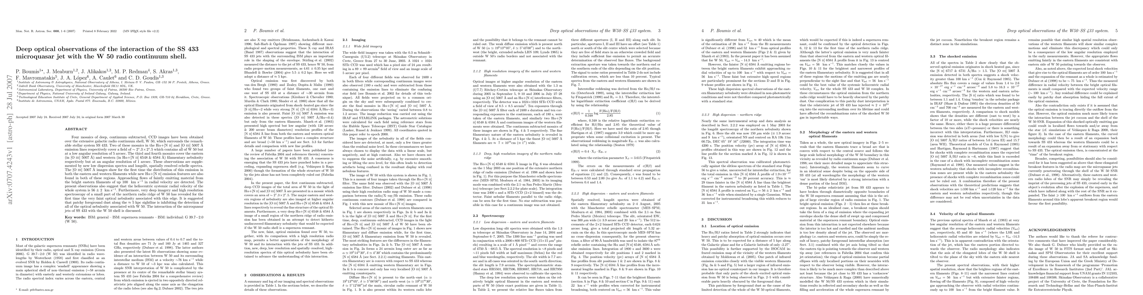 Four mosaics of deep, continuum-subtracted, CCD images have been obtained over the extensive galactic radio continuum shell, W 50, which surrounds the remarkable stellar system SS 433. Two of these mosaics in the Halpha+[N II] and [O III] 5007 A emission lines respectively cover a field of ~2.3 x 2.5 degr^2 which contains all of W 50 but at a low angular resolution of 5 arcsec. The third and fourth mosaics cover the eastern (in [O III] 5007 A) and western (in Halpha+[N II]) filamentary nebulosity respectively but at an angular resolution of 1 arcsec. These observations are supplemented by new low dispersion spectra and longslit, spatially resolved echelle spectra. The [O III] 5007 A images show for the first time the distribution of this emission in both the eastern and western filaments while new Halpha+[N II] emission features are also found in both of these regions. Approaching flows of faintly emitting material from the bright eastern filaments of up 100 km/s in radial velocity are detected. The present observations also suggest that the heliocentric systemic radial velocity of the whole system is 56+-2 km/s. Furthermore, very deep imagery and high resolution spectroscopy of a small part of the northern radio ridge of W 50 has revealed for the first time the very faint optical nebulosity associated with this edge. It is suggested that patchy foreground dust along the ~5 kpc sightline is inhibiting the detection of all of the optical nebulosity associated with W 50. The interaction of the microquasar jets of SS 433 with the W 50 shell is discussed.