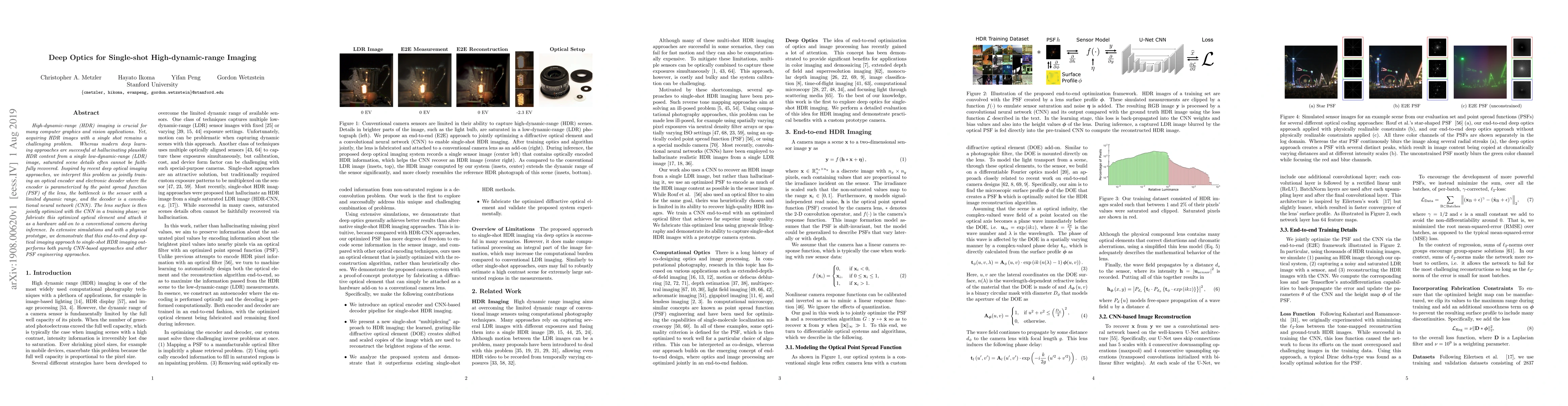 This paper proposes a deep optics method combining an optical encoder and a CNN decoder to achieve single-shot high-dynamic-range imaging, optimizing both the lens and CNN during training for superior performance over traditional CNN-based methods. The approach is validated through simulations and a physical prototype.