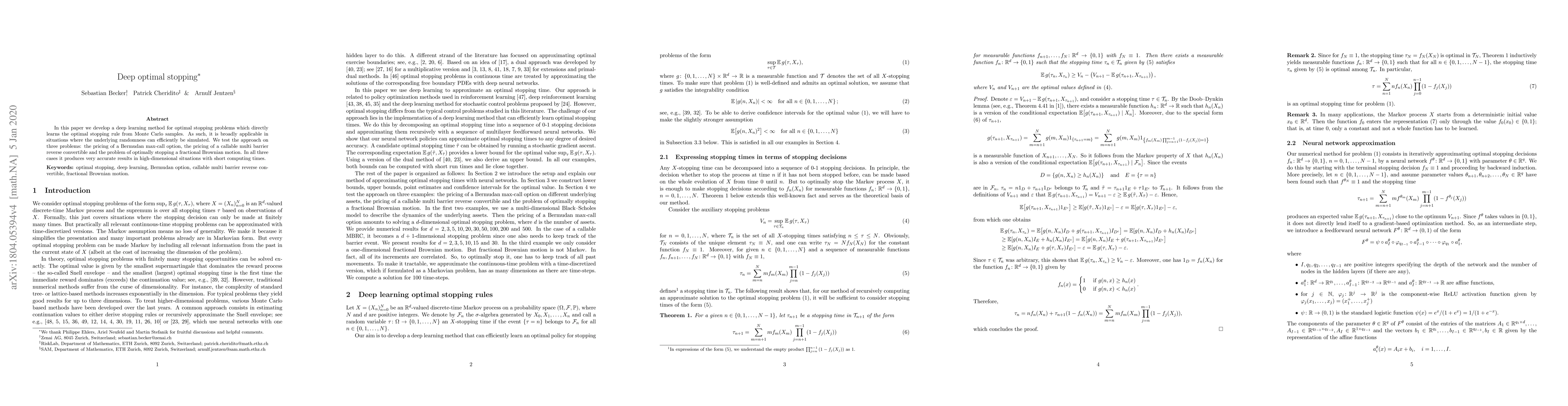 This paper introduces a deep learning method for solving optimal stopping problems by directly learning the optimal stopping rule from Monte Carlo samples, demonstrating high accuracy and efficiency in pricing complex financial derivatives and optimizing stochastic processes.