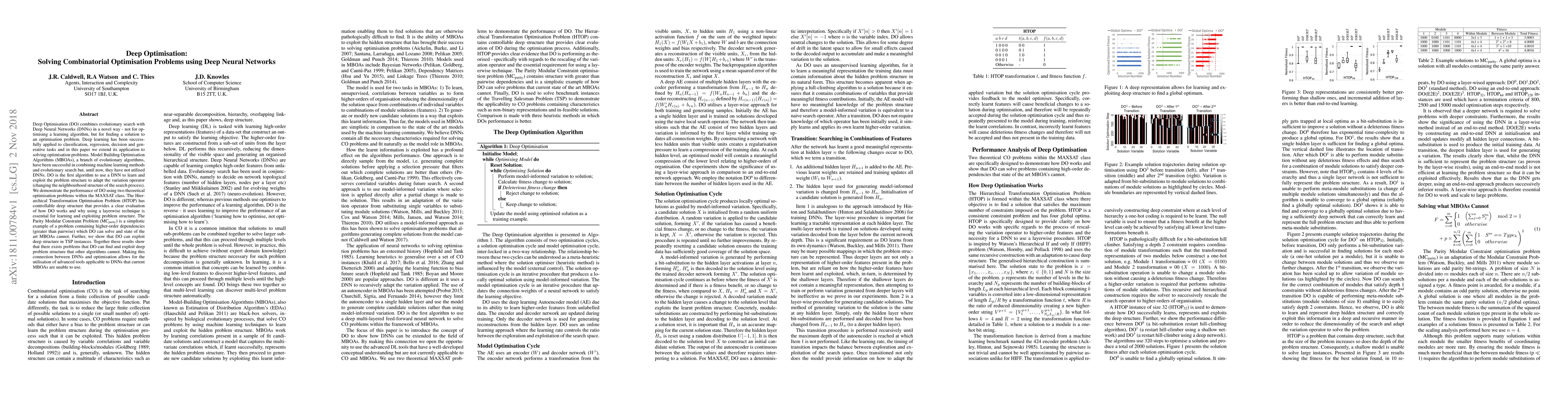 Deep Optimisation (DO) combines evolutionary search with Deep Neural Networks (DNNs) in a novel way - not for optimising a learning algorithm, but for finding a solution to an optimisation problem. Deep learning has been successfully applied to classification, regression, decision and generative tasks and in this paper we extend its application to solving optimisation problems. Model Building Optimisation Algorithms (MBOAs), a branch of evolutionary algorithms, have been successful in combining machine learning methods and evolutionary search but, until now, they have not utilised DNNs. DO is the first algorithm to use a DNN to learn and exploit the problem structure to adapt the variation operator (changing the neighbourhood structure of the search process). We demonstrate the performance of DO using two theoretical optimisation problems within the MAXSAT class. The Hierarchical Transformation Optimisation Problem (HTOP) has controllable deep structure that provides a clear evaluation of how DO works and why using a layerwise technique is essential for learning and exploiting problem structure. The Parity Modular Constraint Problem (MCparity) is a simplistic example of a problem containing higher-order dependencies (greater than pairwise) which DO can solve and state of the art MBOAs cannot. Further, we show that DO can exploit deep structure in TSP instances. Together these results show that there exists problems that DO can find and exploit deep problem structure that other algorithms cannot. Making this connection between DNNs and optimisation allows for the utilisation of advanced tools applicable to DNNs that current MBOAs are unable to use.