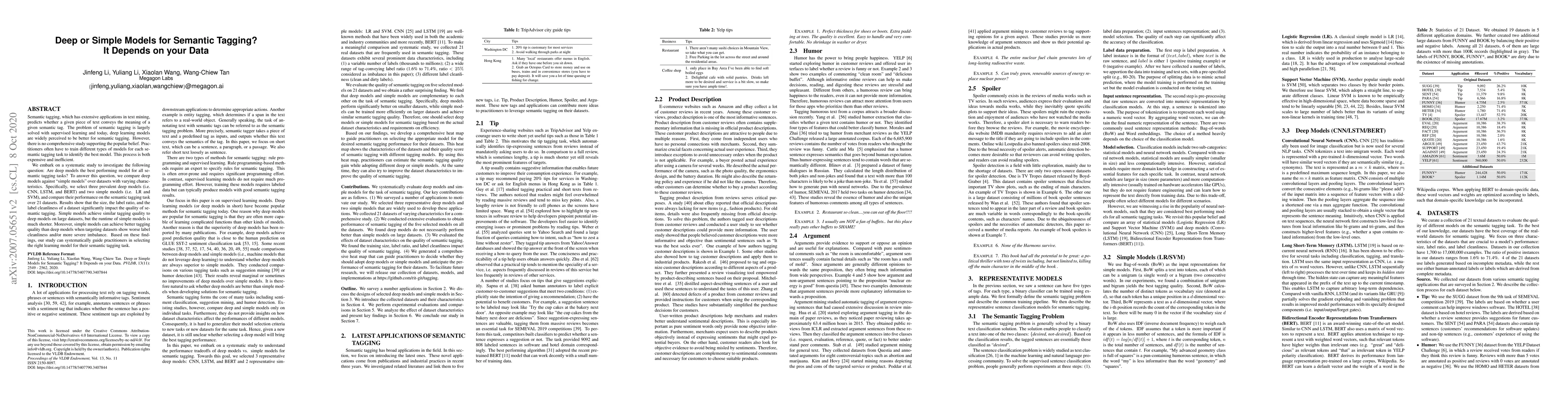 Semantic tagging, which has extensive applications in text mining, predicts whether a given piece of text conveys the meaning of a given semantic tag. The problem of semantic tagging is largely solved with supervised learning and today, deep learning models are widely perceived to be better for semantic tagging. However, there is no comprehensive study supporting the popular belief. Practitioners often have to train different types of models for each semantic tagging task to identify the best model. This process is both expensive and inefficient. We embark on a systematic study to investigate the following question: Are deep models the best performing model for all semantic tagging tasks? To answer this question, we compare deep models against "simple models" over datasets with varying characteristics. Specifically, we select three prevalent deep models (i.e. CNN, LSTM, and BERT) and two simple models (i.e. LR and SVM), and compare their performance on the semantic tagging task over 21 datasets. Results show that the size, the label ratio, and the label cleanliness of a dataset significantly impact the quality of semantic tagging. Simple models achieve similar tagging quality to deep models on large datasets, but the runtime of simple models is much shorter. Moreover, simple models can achieve better tagging quality than deep models when targeting datasets show worse label cleanliness and/or more severe imbalance. Based on these findings, our study can systematically guide practitioners in selecting the right learning model for their semantic tagging task.