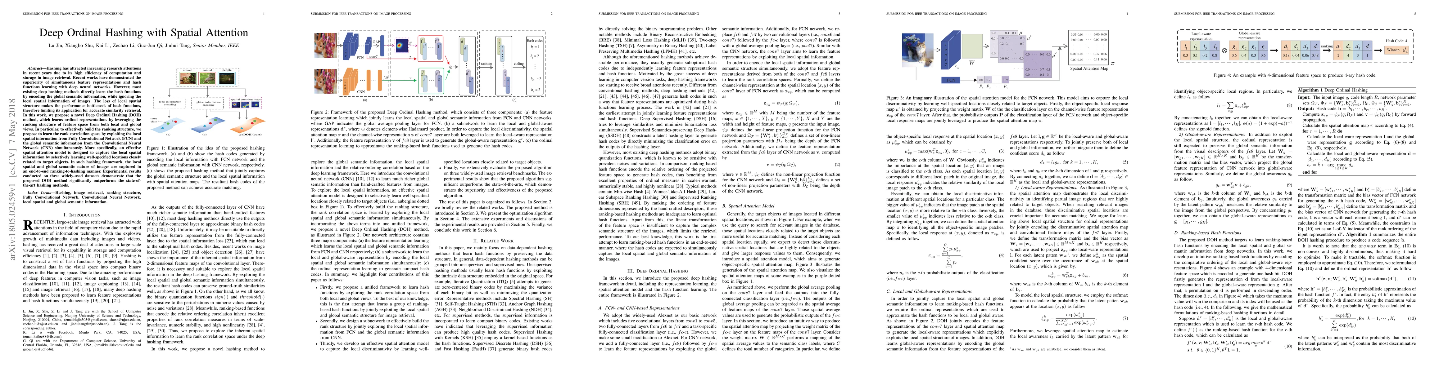 The paper proposes Deep Ordinal Hashing (DOH) to enhance image retrieval efficiency by learning both local spatial and global semantic information through a spatial attention model. The method outperforms existing deep hashing methods by capturing the ordinal representations from both perspectives, achieving better accuracy in similarity retrieval.