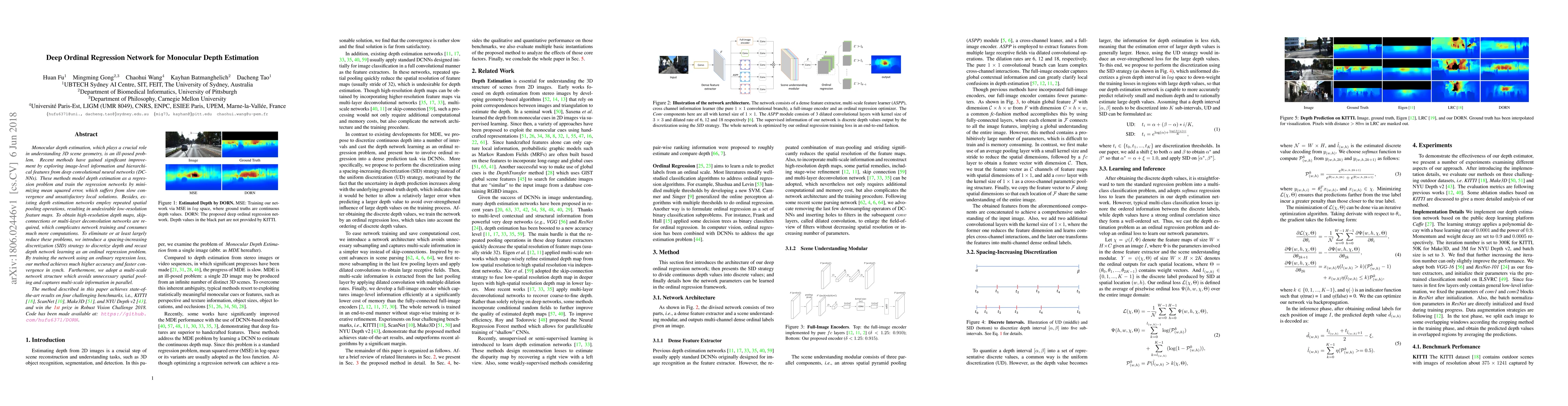 This paper introduces a Deep Ordinal Regression Network (DORN) for monocular depth estimation, addressing issues of slow convergence and low-resolution features in existing methods. It recasts depth estimation as an ordinal regression problem using a spacing-increasing discretization strategy, achieving higher accuracy and faster convergence, while employing a multi-scale network structure to capture multi-scale features without spatial pooling.