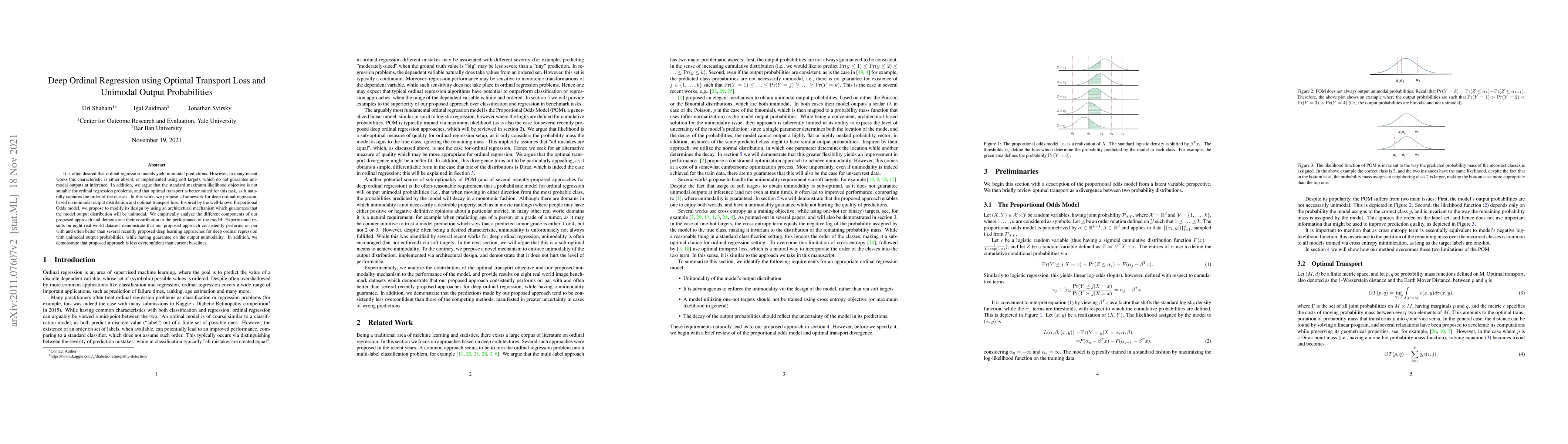 This paper proposes a deep ordinal regression framework using optimal transport loss and unimodal output probabilities, arguing that it better captures class order compared to maximum likelihood. The approach guarantees unimodal outputs and outperforms recent deep learning methods on multiple datasets, while also showing less overconfidence.