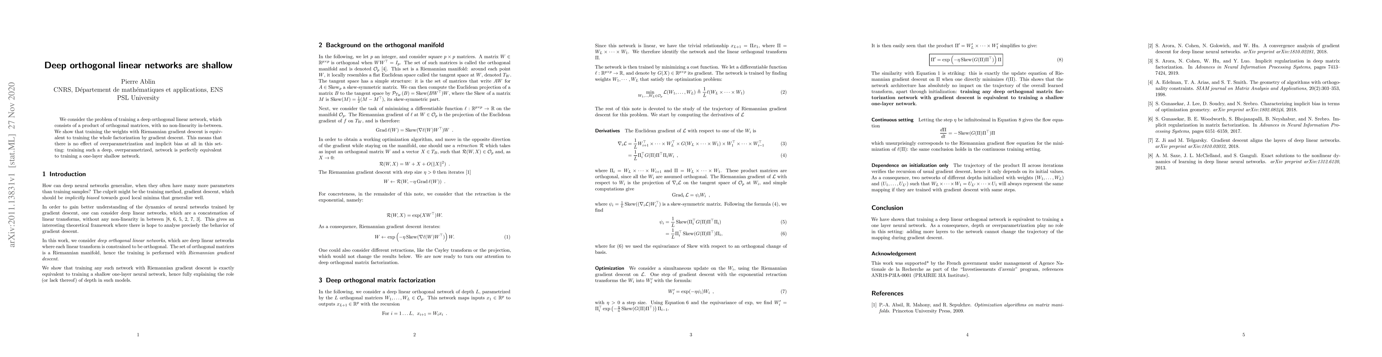 Researchers show that training a deep orthogonal linear network is equivalent to training a one-layer shallow network using Riemannian gradient descent, eliminating overparametrization effects.