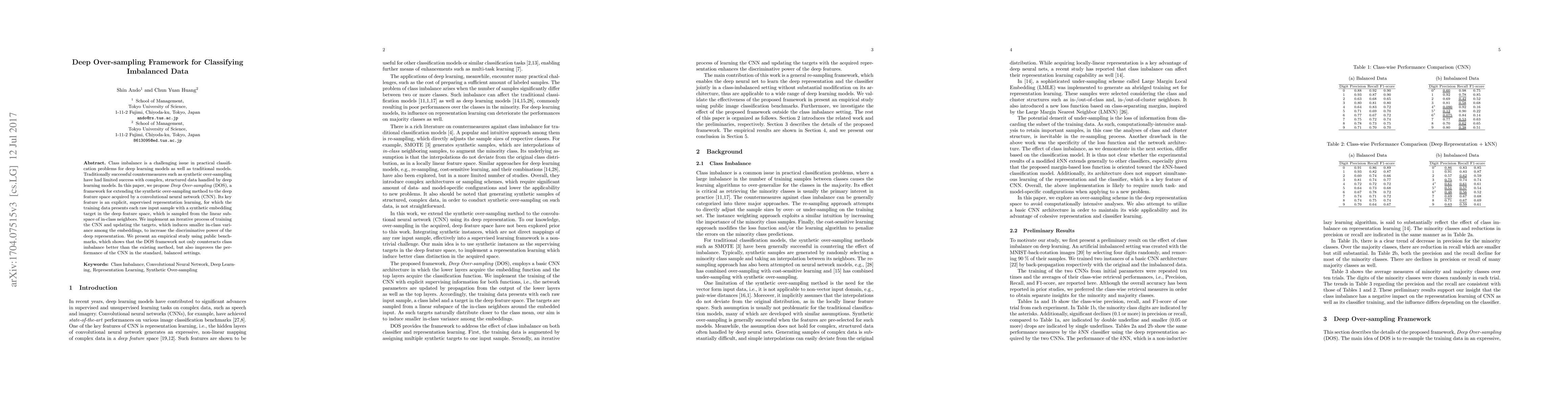 Class imbalance is a challenging issue in practical classification problems for deep learning models as well as traditional models. Traditionally successful countermeasures such as synthetic over-sampling have had limited success with complex, structured data handled by deep learning models. In this paper, we propose Deep Over-sampling (DOS), a framework for extending the synthetic over-sampling method to exploit the deep feature space acquired by a convolutional neural network (CNN). Its key feature is an explicit, supervised representation learning, for which the training data presents each raw input sample with a synthetic embedding target in the deep feature space, which is sampled from the linear subspace of in-class neighbors. We implement an iterative process of training the CNN and updating the targets, which induces smaller in-class variance among the embeddings, to increase the discriminative power of the deep representation. We present an empirical study using public benchmarks, which shows that the DOS framework not only counteracts class imbalance better than the existing method, but also improves the performance of the CNN in the standard, balanced settings.