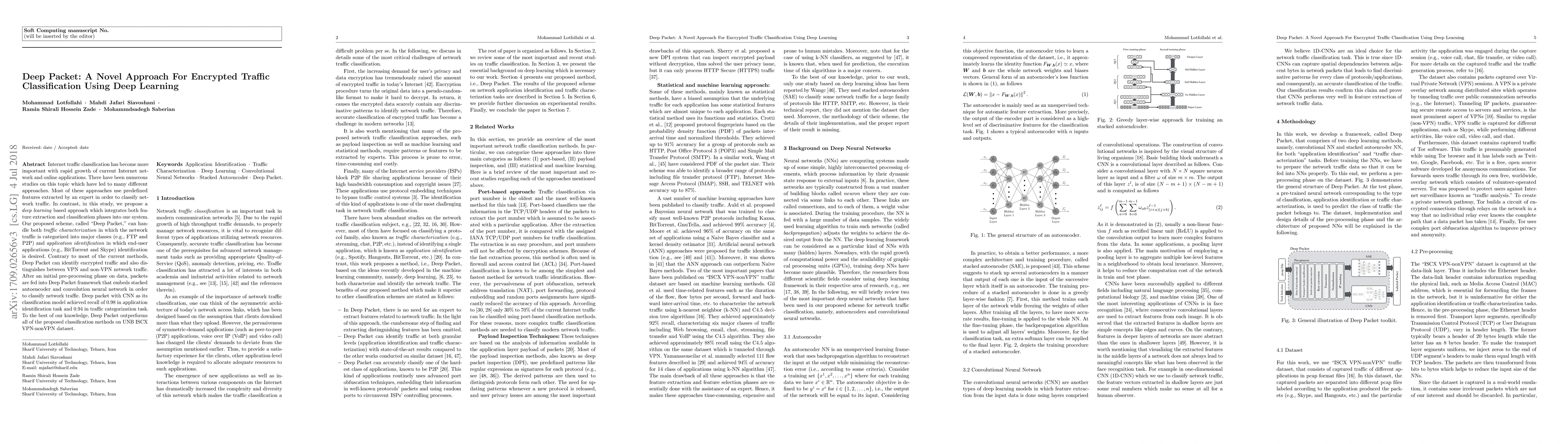 This paper proposes "Deep Packet," a novel deep learning approach for classifying encrypted internet traffic, integrating feature extraction and classification into one system. Deep Packet uses stacked autoencoders and convolutional neural networks to achieve high recall rates in both application identification and traffic categorization tasks, outperforming existing methods on the UNB ISCX VPN-nonVPN dataset.