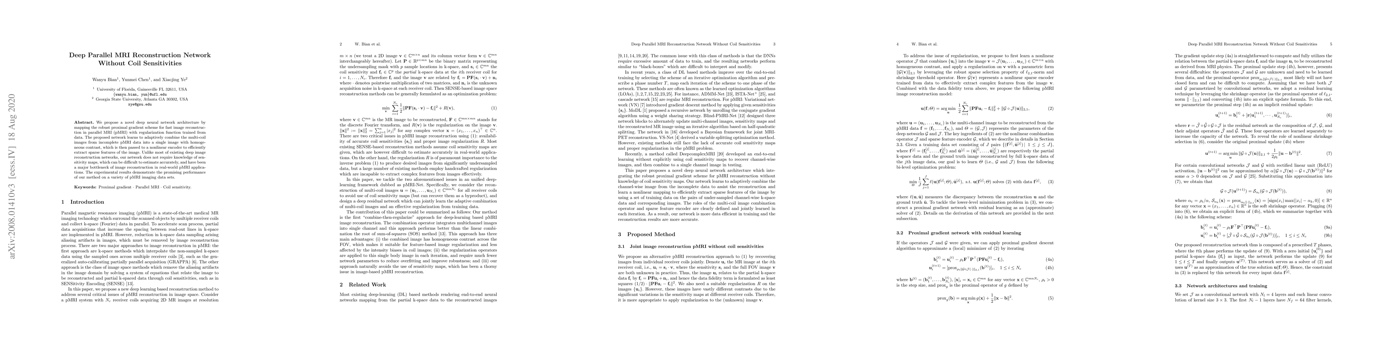 We propose a novel deep neural network architecture by mapping the robust proximal gradient scheme for fast image reconstruction in parallel MRI (pMRI) with regularization function trained from data. The proposed network learns to adaptively combine the multi-coil images from incomplete pMRI data into a single image with homogeneous contrast, which is then passed to a nonlinear encoder to efficiently extract sparse features of the image. Unlike most of existing deep image reconstruction networks, our network does not require knowledge of sensitivity maps, which can be difficult to estimate accurately, and have been a major bottleneck of image reconstruction in real-world pMRI applications. The experimental results demonstrate the promising performance of our method on a variety of pMRI imaging data sets.