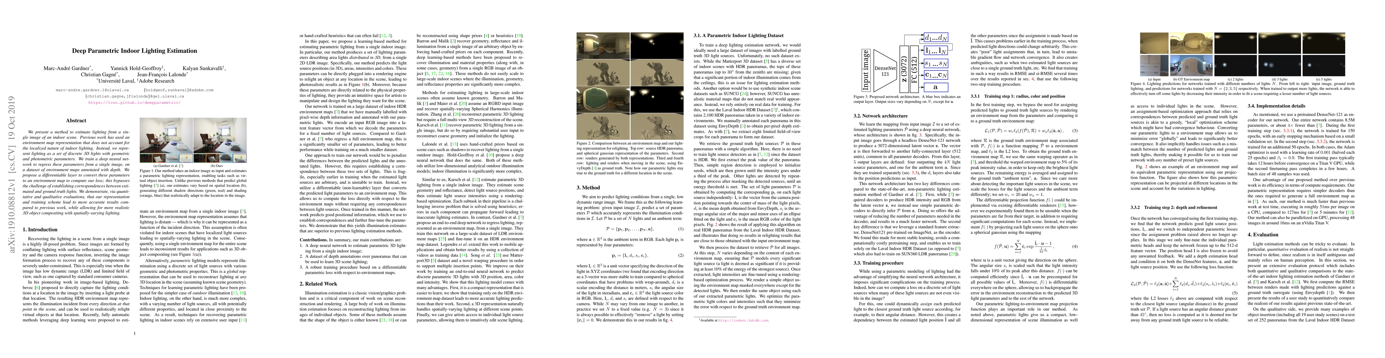 This paper proposes a method to estimate localized indoor lighting from a single image using a deep neural network that regresses parameters of discrete 3D lights. It introduces a differentiable layer to convert these parameters into an environment map for loss computation, leading to more accurate and realistic results compared to previous environment map-based methods.