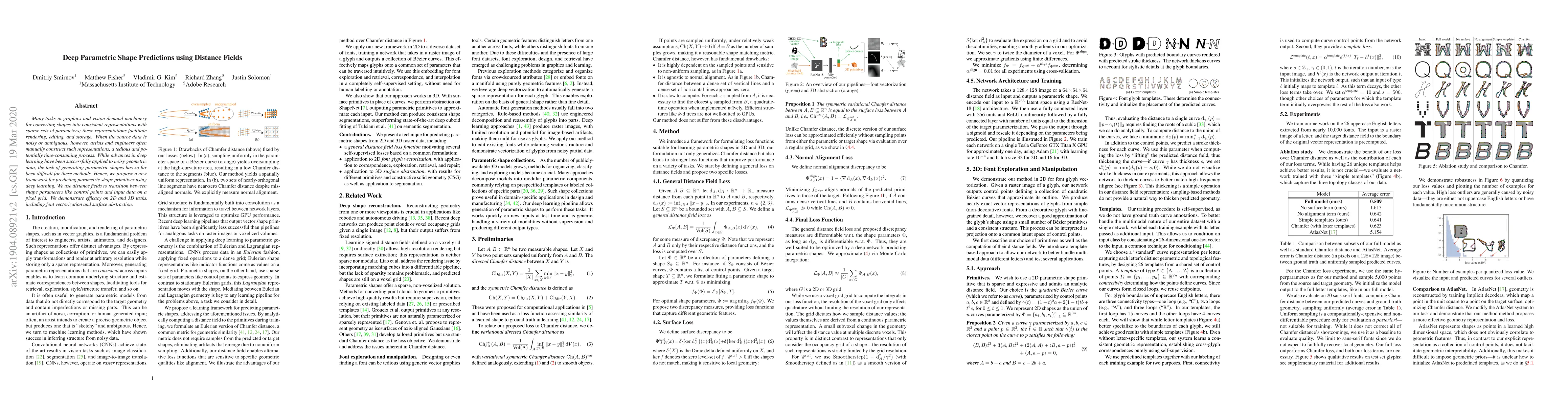 This paper introduces a deep learning framework for predicting parametric shape primitives using distance fields, aiming to automate the conversion of noisy geometric data into consistent representations. The proposed method facilitates tasks like font vectorization and surface abstraction, reducing the need for manual intervention.