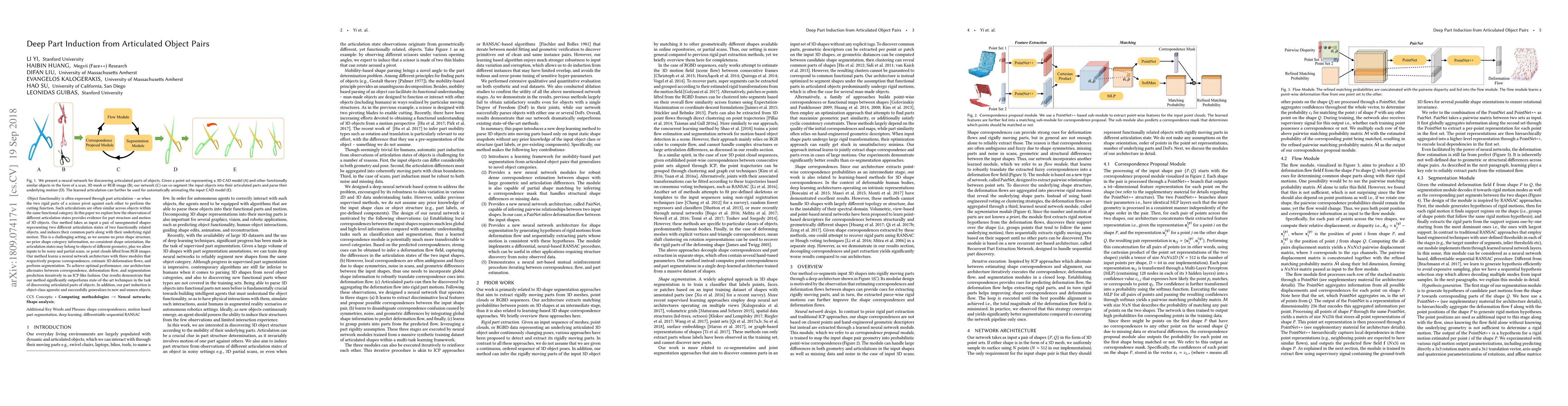 Object functionality is often expressed through part articulation -- as when the two rigid parts of a scissor pivot against each other to perform the cutting function. Such articulations are often similar across objects within the same functional category. In this paper, we explore how the observation of different articulation states provides evidence for part structure and motion of 3D objects. Our method takes as input a pair of unsegmented shapes representing two different articulation states of two functionally related objects, and induces their common parts along with their underlying rigid motion. This is a challenging setting, as we assume no prior shape structure, no prior shape category information, no consistent shape orientation, the articulation states may belong to objects of different geometry, plus we allow inputs to be noisy and partial scans, or point clouds lifted from RGB images. Our method learns a neural network architecture with three modules that respectively propose correspondences, estimate 3D deformation flows, and perform segmentation. To achieve optimal performance, our architecture alternates between correspondence, deformation flow, and segmentation prediction iteratively in an ICP-like fashion. Our results demonstrate that our method significantly outperforms state-of-the-art techniques in the task of discovering articulated parts of objects. In addition, our part induction is object-class agnostic and successfully generalizes to new and unseen objects.