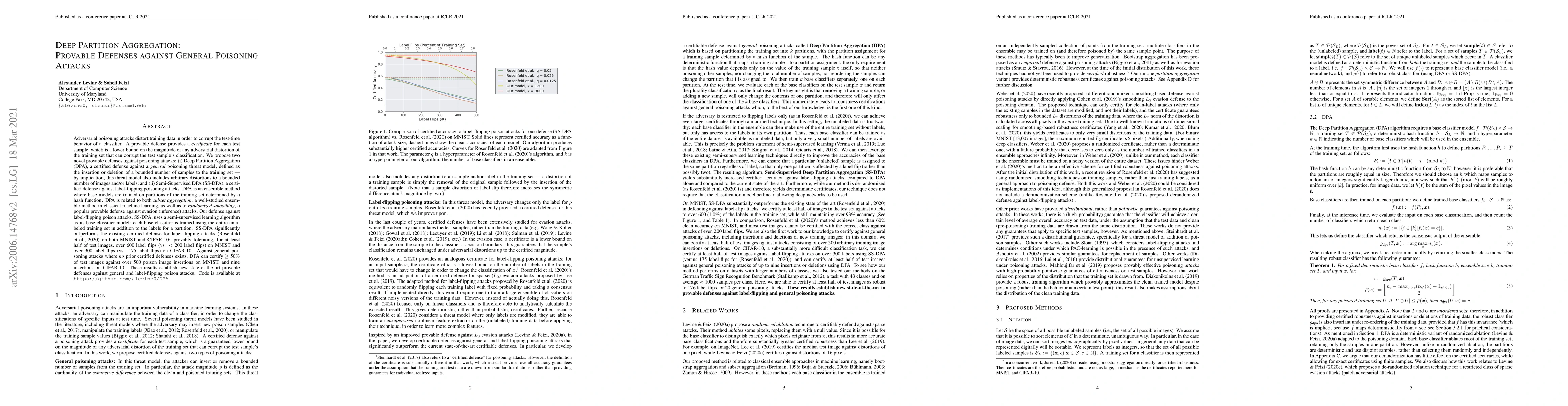This paper introduces Deep Partition Aggregation (DPA) and Semi-Supervised DPA (SS-DPA), two novel ensemble-based defenses against adversarial poisoning attacks. DPA partitions training data to create base models, providing certified robustness against general poisoning threats. SS-DPA enhances DPA for label-flipping attacks, significantly outperforming existing defenses on MNIST and CIFAR-10 datasets.