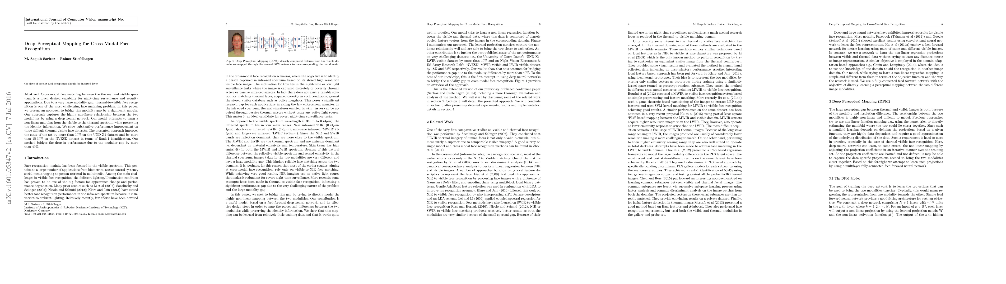 This paper proposes a deep neural network approach to bridge the modality gap for cross-modal face recognition between thermal and visible images, achieving significant performance improvements on three datasets, surpassing the state-of-the-art by over 10% on UND-X1 and by 15-30% on NVESD.