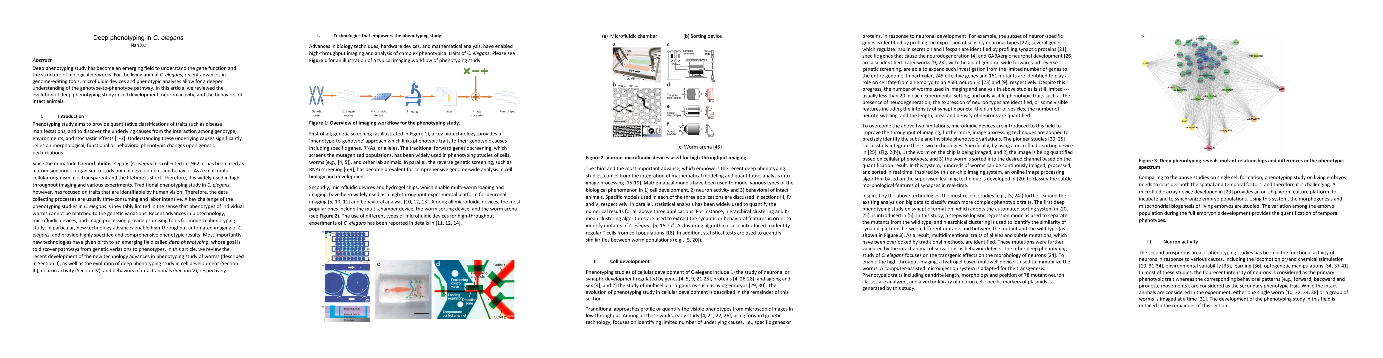 Deep phenotyping study has become an emerging field to understand the gene function and the structure of biological networks. For the living animal C. elegans, recent advances in genome-editing tools, microfluidic devices and phenotypic analyses allow for a deeper understanding of the genotype-to-phenotype pathway. In this article, I reviewed the evolution of deep phenotyping study in cell development, neuron activity, and the behaviors of intact animals.